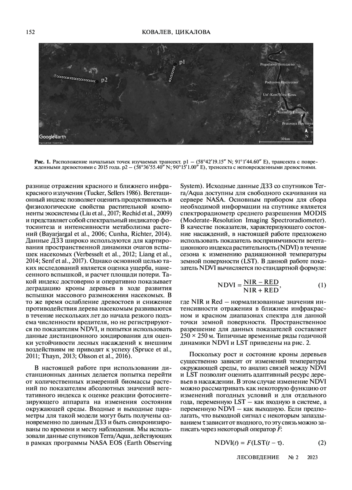 Вспышки массового размножения сибирского шелкопряда (Dendrolimus sibiricus Tschetv.) в таежных лесах Сибири начинаются с очагов площадями в единицы га и достигают площадей в сотни тысяч га, что ведет к значительным повреждениям лесов. Границы очагов изменяются во времени и пространстве в зависимости от внешних факторов, динамики популяции и состояния кормовых деревьев. Борьбу с вредителем необходимо начинать за 1–2 года до достижения пика плотности популяции насекомого. В связи с этим важно знать предикторы повышения численности вредителя, заблаговременно определять момент начала вспышек и зоны, в пределах которых возникают вспышки. Для оценки необходимых условий возникновения вспышки предлагается метод оценки состояния лесных насаждений по данным дистанционного зондирования Земли (ДЗЗ)