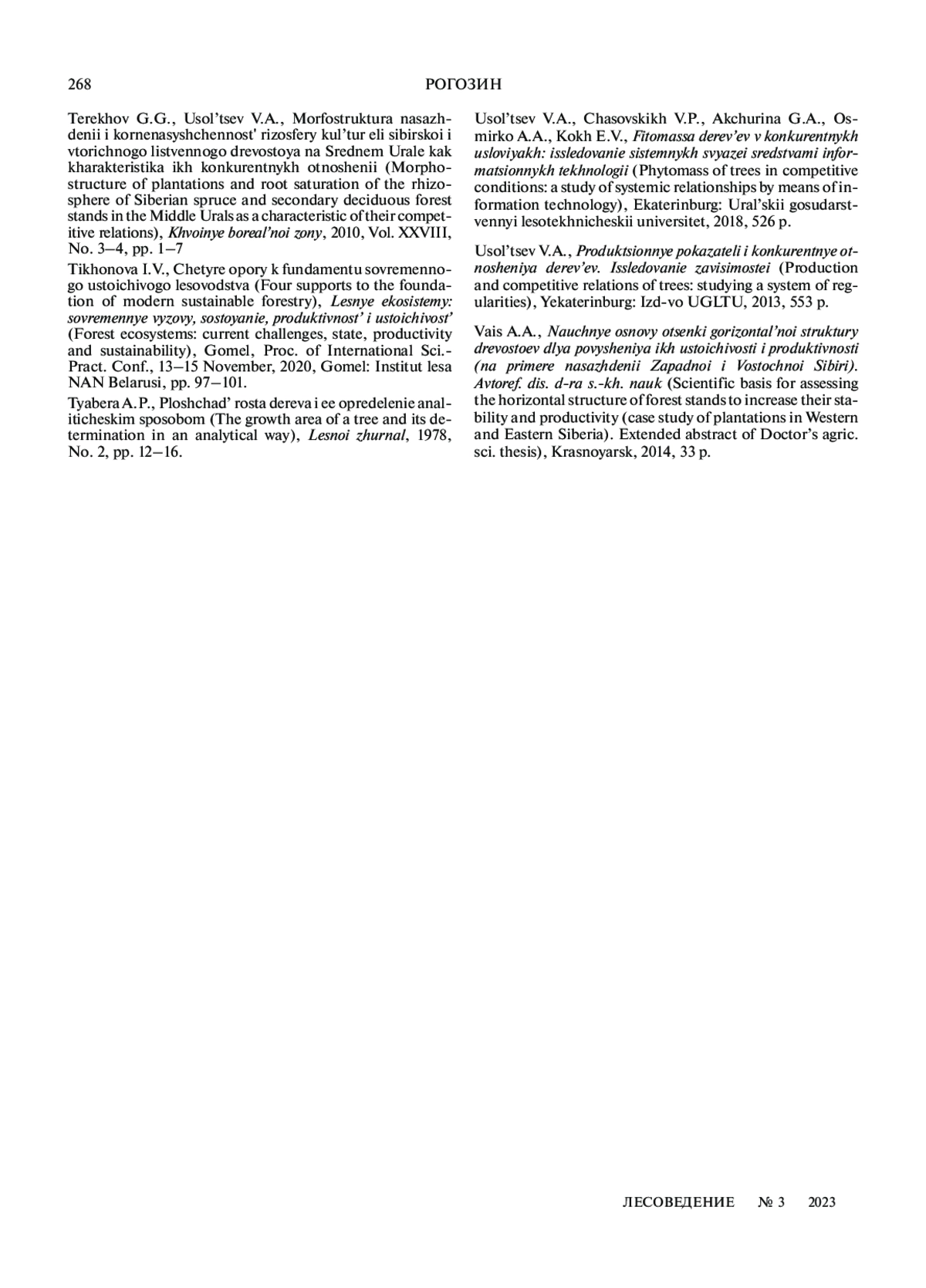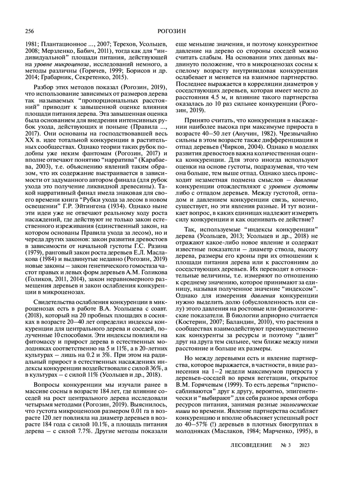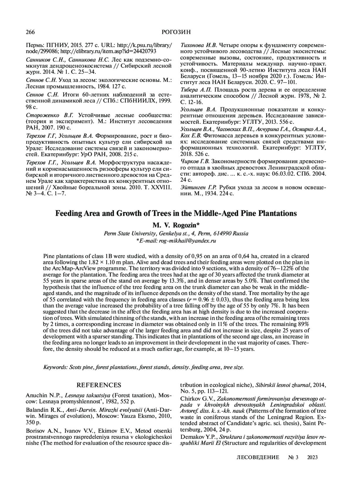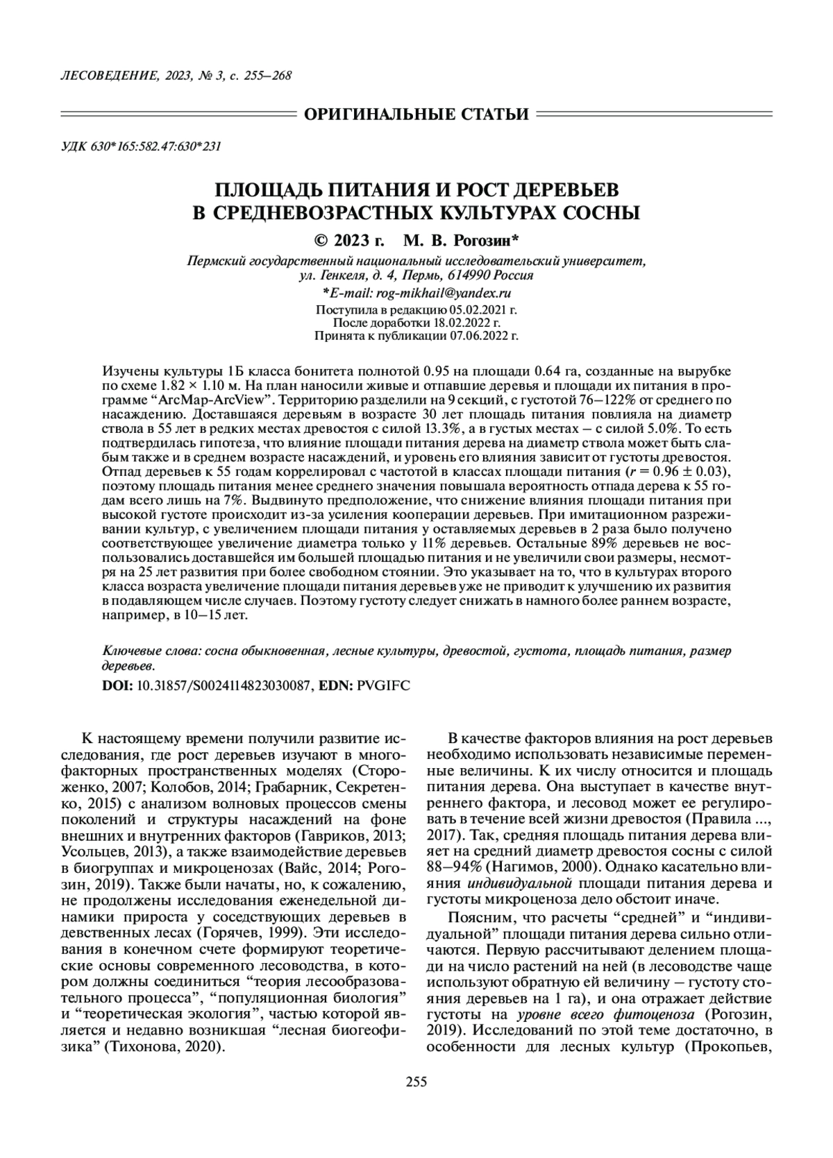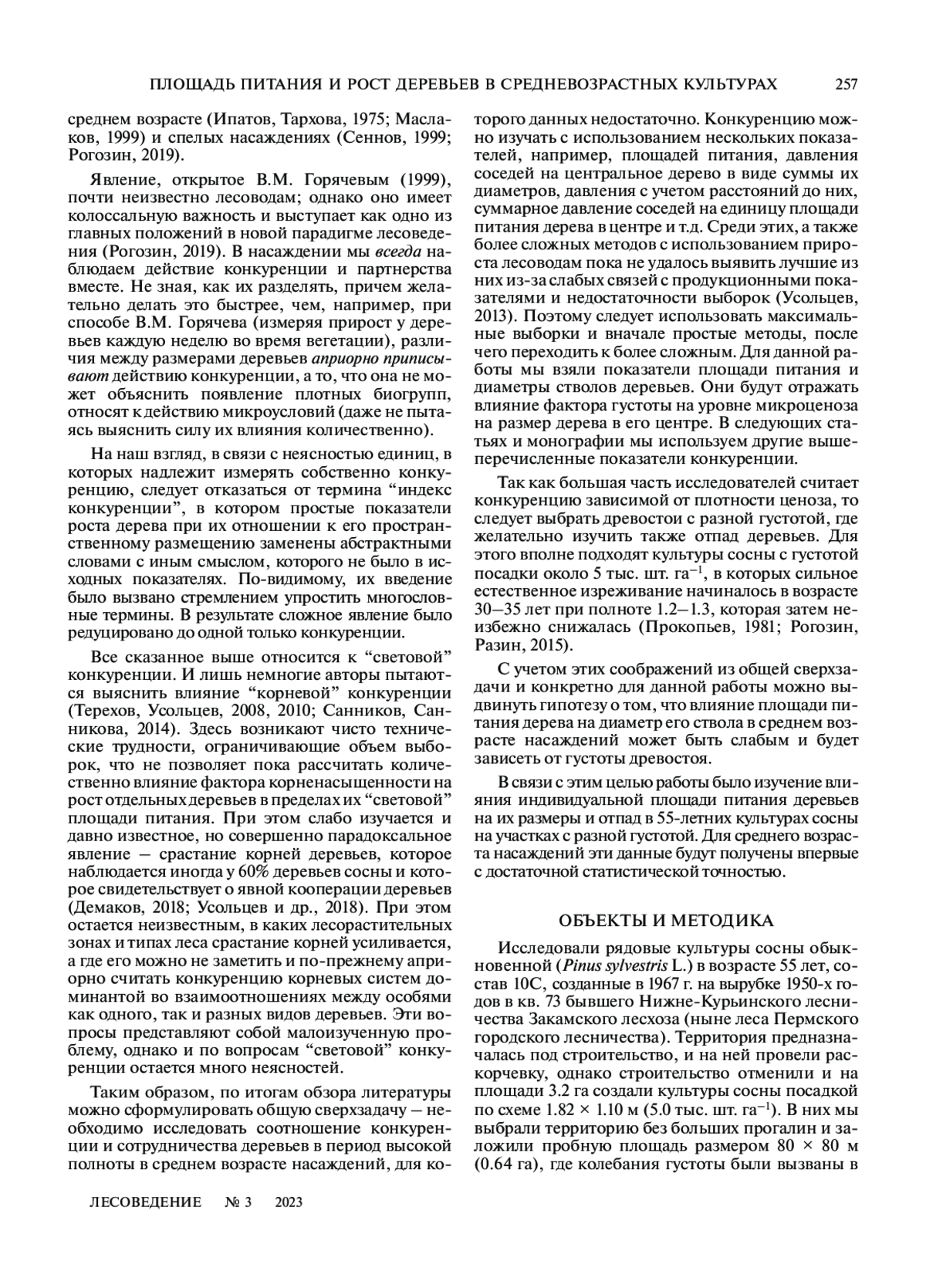 РОГОЗИН М. В. ПЛОЩАДЬ ПИТАНИЯ И РОСТ ДЕРЕВЬЕВ В СРЕДНЕВОЗРАСТНЫХ КУЛЬТУРАХ СОСНЫ // ЛЕСОВЕДЕНИЕ. 2023. № 3