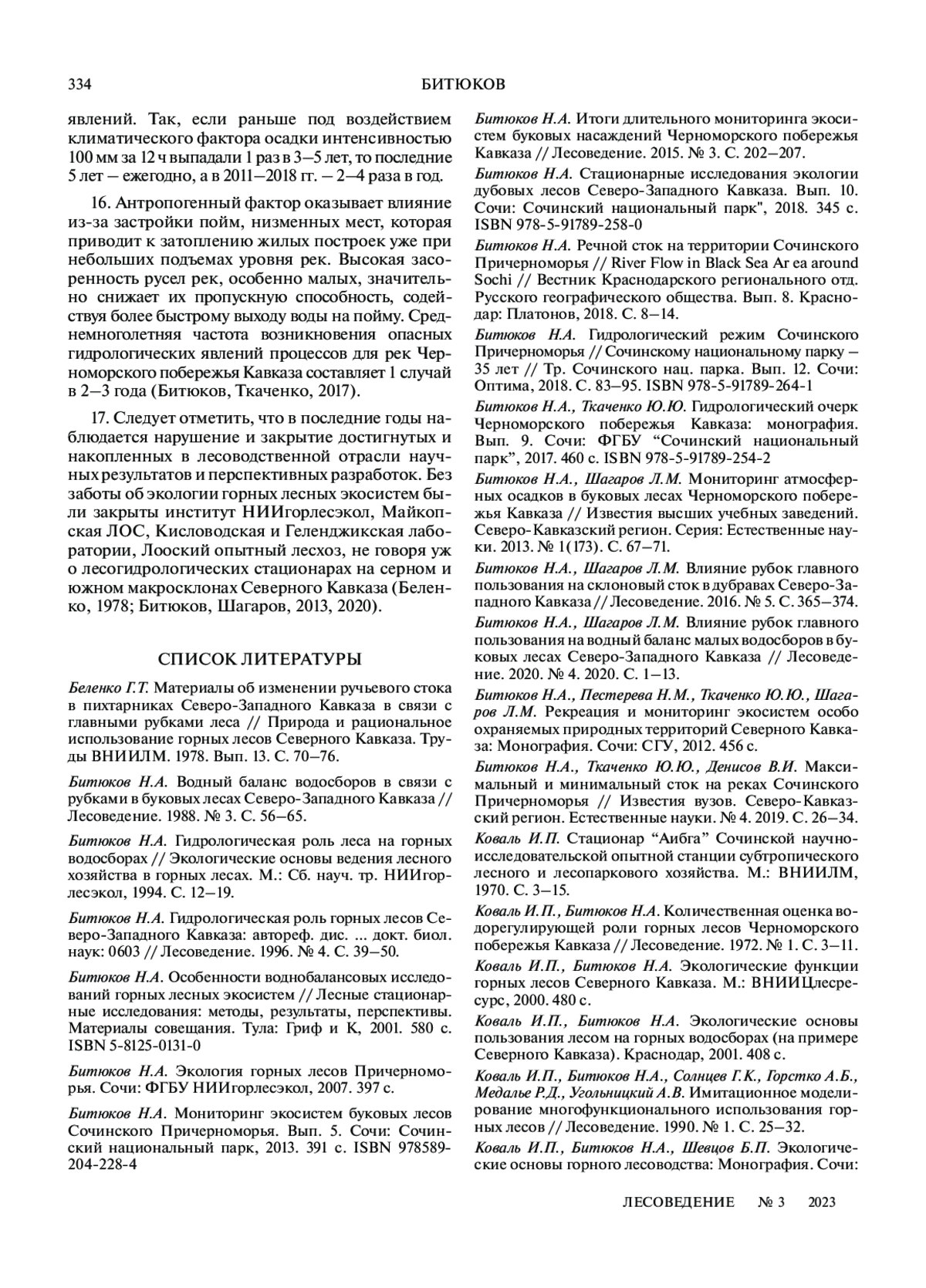 2. Битюков Н.А. Водный баланс водосборов в связи с рубками в буковых лесах Северо-Западного Кавказа // Лесоведение. 1988. № 3. С. 56–65.