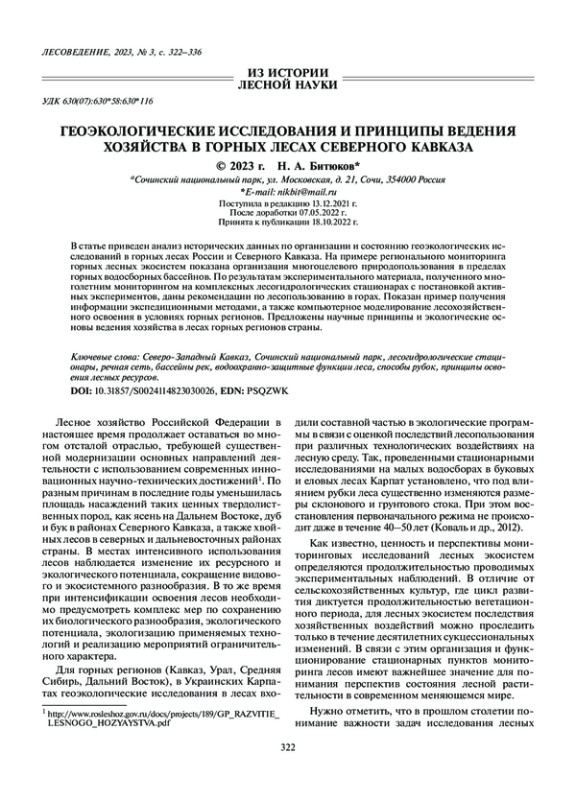 В статье приведен анализ исторических данных по организации и состоянию геоэкологических исследований в горных лесах России и Северного Кавказа. На примере регионального мониторинга горных лесных экосистем показана организация многоцелевого природопользования в пределах горных водосборных бассейнов. По результатам экспериментального материала, полученного многолетним мониторингом на комплексных лесогидрологических стационарах с постановкой активных экспериментов, даны рекомендации по лесопользованию в горах. Показан пример получения информации экспедиционными методами, а также компьютерное моделирование лесохозяйственного освоения в условиях горных регионов. Предложены научные принципы и экологические основы ведения хозяйства в лесах горных регионов страны
