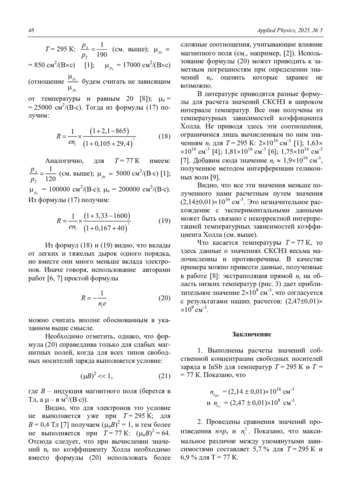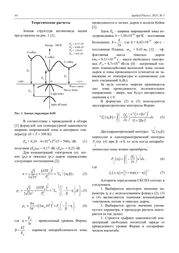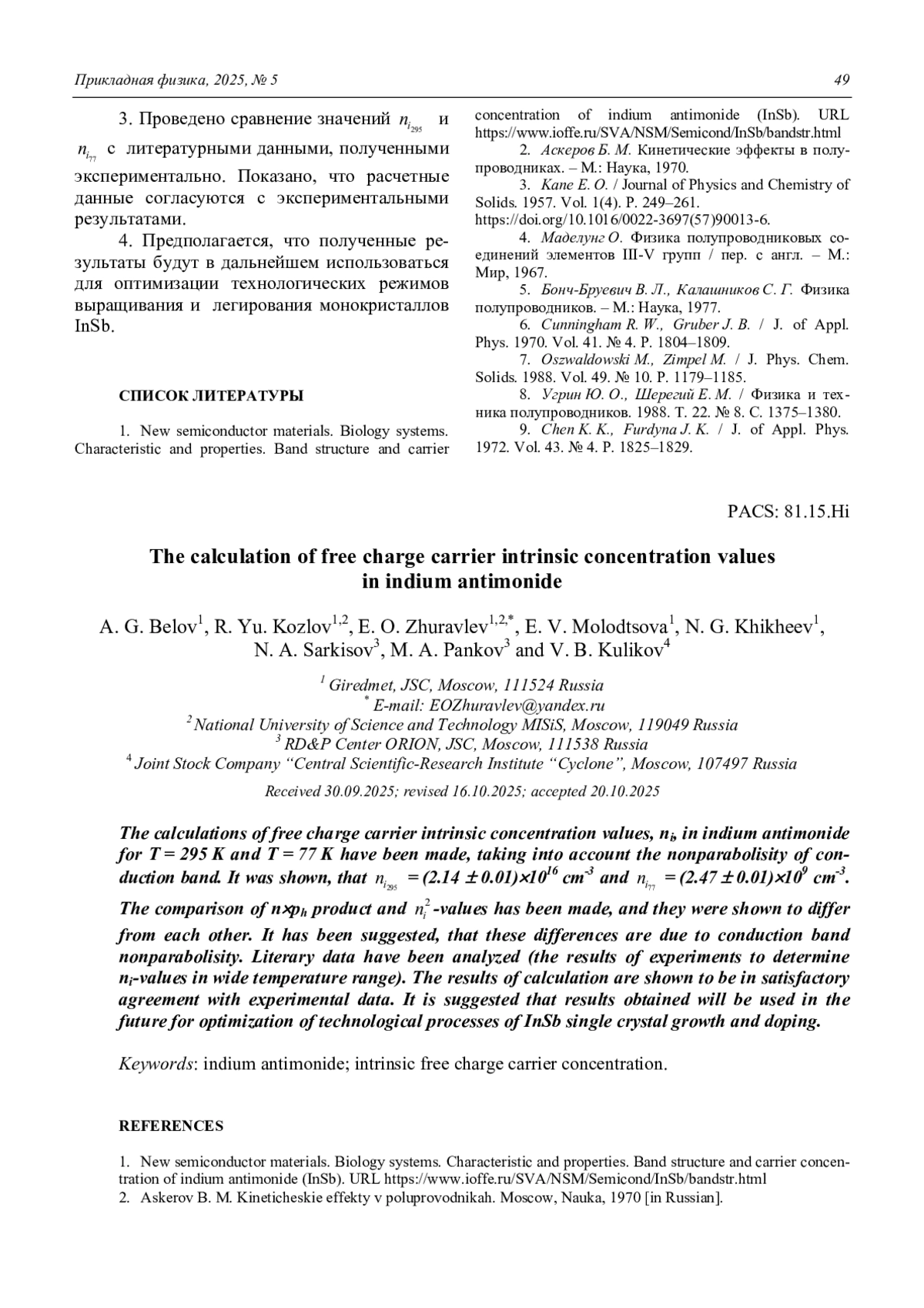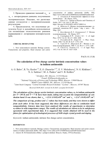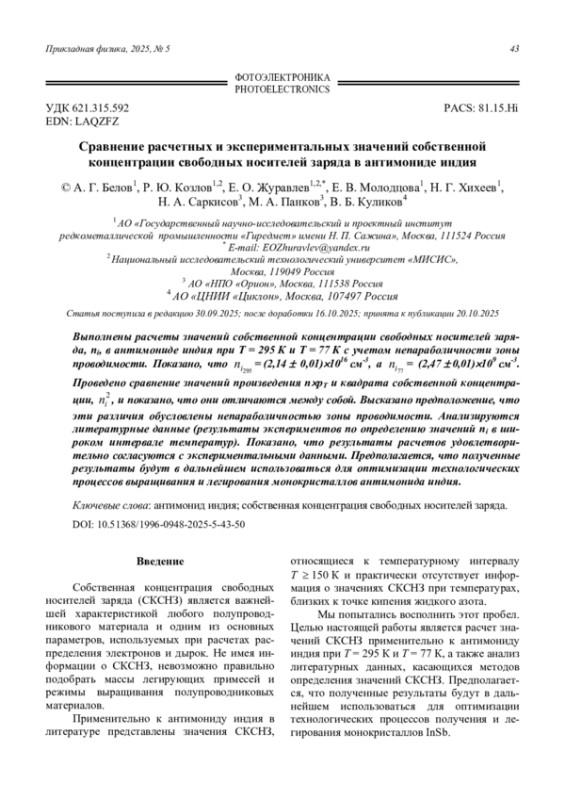 Выполнены расчеты значений собственной концентрации свободных носителей заря-да, ni, в антимониде индия при Т = 295 К и Т = 77 К с учетом непараболичности зоны проводимости. Показано, что = (2,14 0,01)1016 см-3, а = (2,47 0,01)109 см-3. Проведено сравнение значений произведения npТ и квадрата собственной концентрации,, и показано, что они отличаются между собой. Высказано предположение, что эти различия обусловлены непараболичностью зоны проводимости. Анализируются литературные данные (результаты экспериментов по определению значений ni в широком интервале температур). Показано, что результаты расчетов удо-влетворительно согласуются с экспериментальными данными. Предполагается, что полученные результаты будут в дальнейшем использоваться для оптимизации технологических процессов выращивания и легирования монокристаллов антимонида индия.