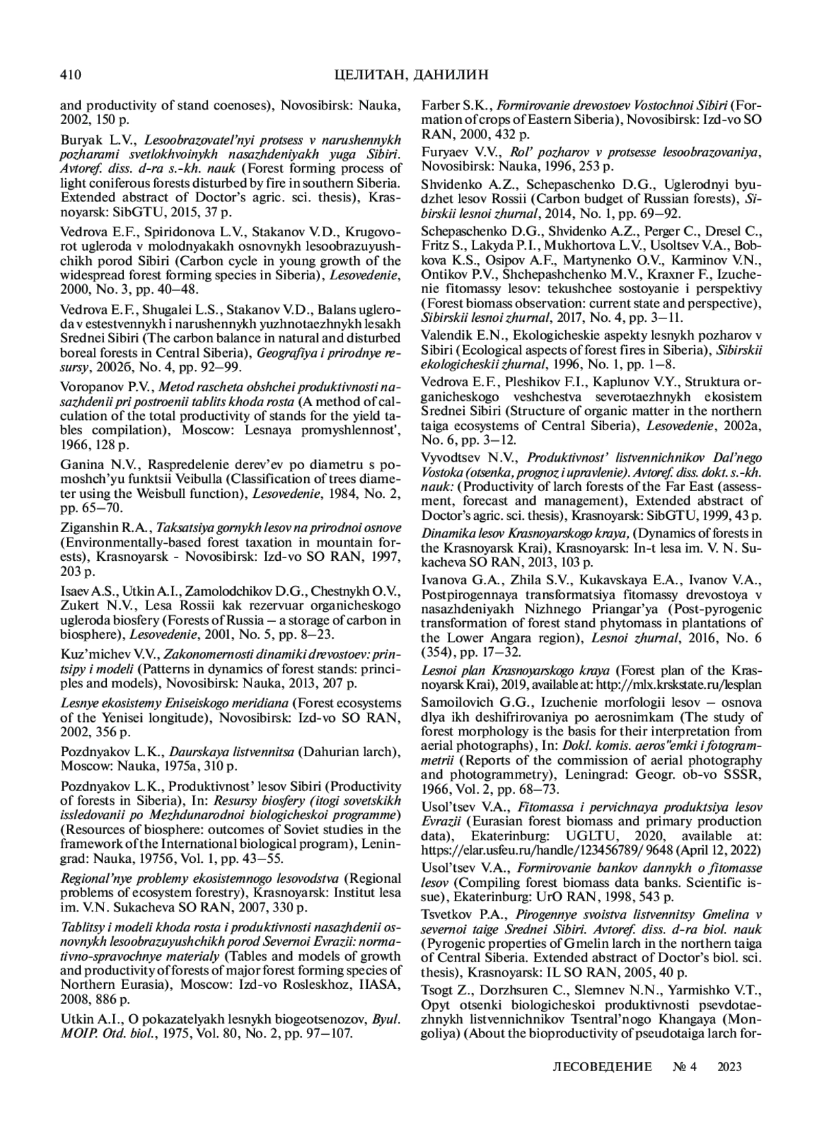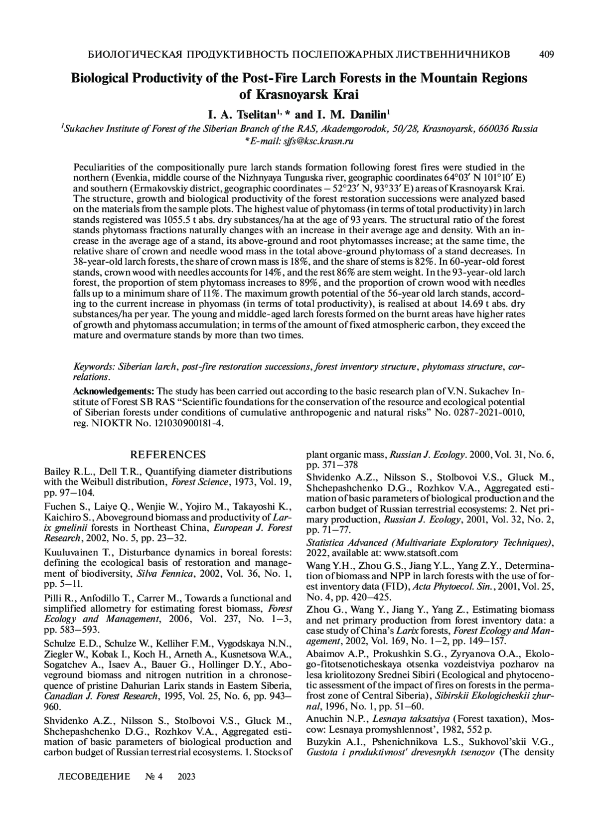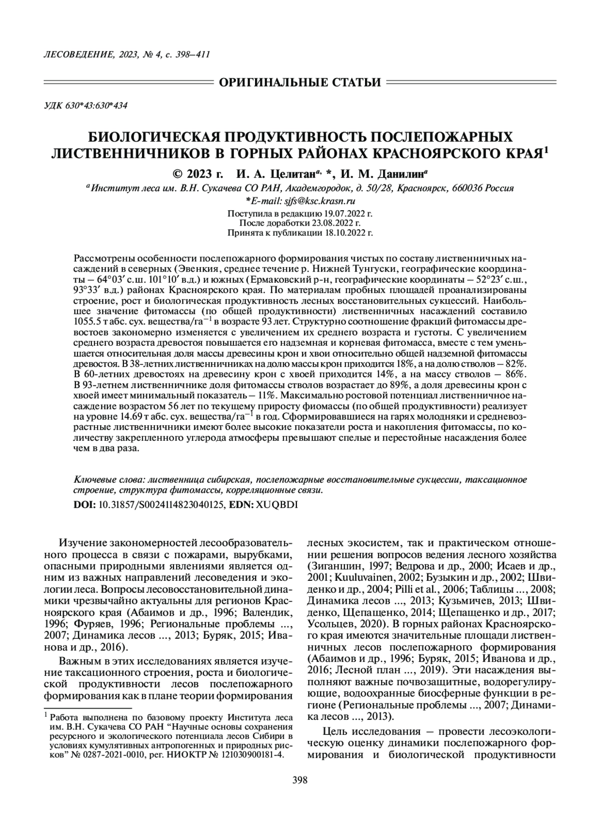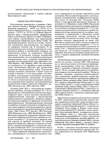 ЦЕЛИТАН И. А., ДАНИЛИН И. М. БИОЛОГИЧЕСКАЯ ПРОДУКТИВНОСТЬ ПОСЛЕПОЖАРНЫХ ЛИСТВЕННИЧНИКОВ В ГОРНЫХ РАЙОНАХ КРАСНОЯРСКОГО КРАЯ // ЛЕСОВЕДЕНИЕ. 2023. № 4