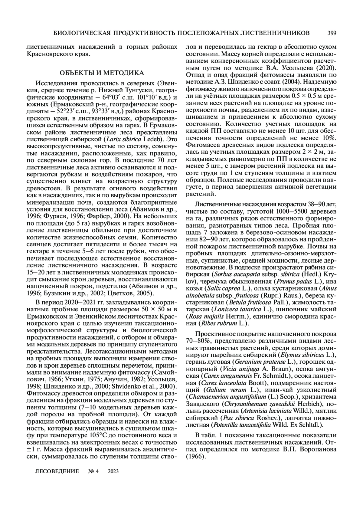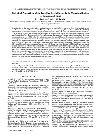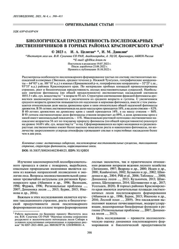 Статья: БИОЛОГИЧЕСКАЯ ПРОДУКТИВНОСТЬ ПОСЛЕПОЖАРНЫХ ЛИСТВЕННИЧНИКОВ В ГОРНЫХ РАЙОНАХ КРАСНОЯРСКОГО КРАЯ (2023)