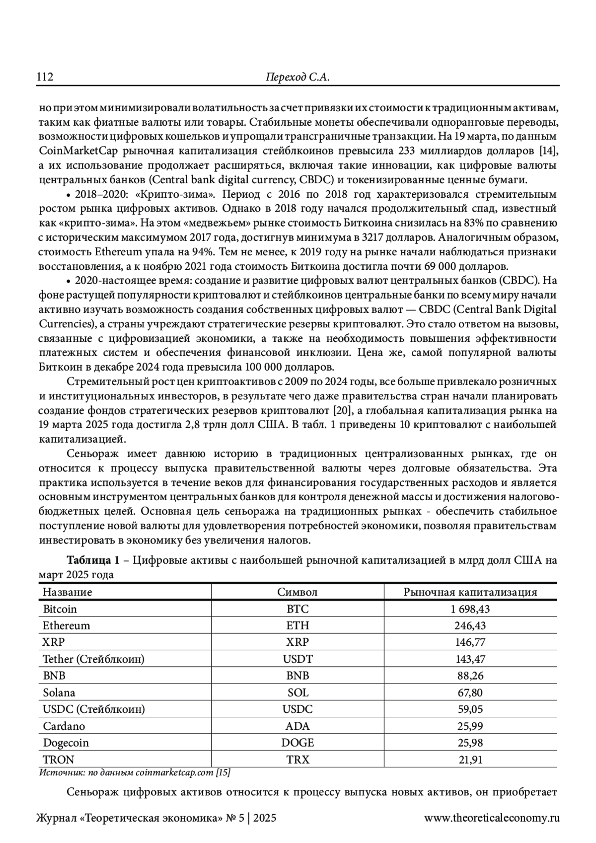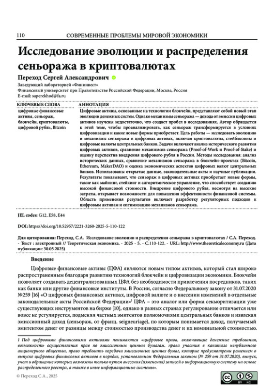Цифровые активы, основанные на технологии блокчейн, представляют собой новый этап эволюции денежных систем. Однако механизмы сеньоража - дохода от эмиссии цифровых активов изучены недостаточно, что создает пробел в исследованиях. Автор обращается к этой теме, чтобы проанализировать, как сеньораж трансформируется в условиях цифровизации и какие новые формы приобретает. Цель работы - исследовать эволюцию и механизмы сеньоража в цифровых активах, включая криптовалюты, стейблкоины и цифровые валюты центральных банков. Задачи включают анализ исторического развития цифровых активов, сравнение механизмов сеньоража (Proof-of-Work и Proof-of-Stake) и оценку перспектив внедрения цифрового рубля в России. Методы исследования: анализ исторических данных, сравнение механизмов сеньоража в блокчейн-проектах (Bitcoin, Ethereum, MakerDAO) и оценка экономических аспектов цифровых валют центральных банков. Использованы открытые данные, законодательные акты и научные публикации. Результаты показывают, что сеньораж в цифровых активах приобретает новые формы, такие как майнинг, стейкинг и алгоритмическое управление, что способствует созданию высокой финансовой стоимости. Внедрение цифрового рубля, несмотря на высокие затраты, открывает возможности для повышения эффективности финансовой системы. Область применения результатов включает разработку регуляторных подходов к цифровым активам и оптимизацию механизмов сеньоража.