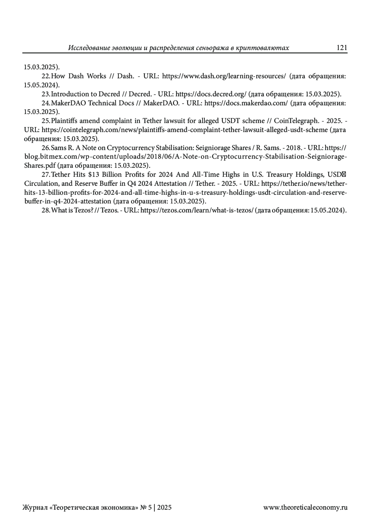 26. Sams R. A Note on Cryptocurrency Stabilisation: Seigniorage Shares / R. Sams. - 2018. - URL: https://blog.bitmex.com/wp-content/uploads/2018/06/A-Note-on-Cryptocurrency-Stabilisation-Seigniorage-Shares.pdf (дата обращения: 15.03.2025).