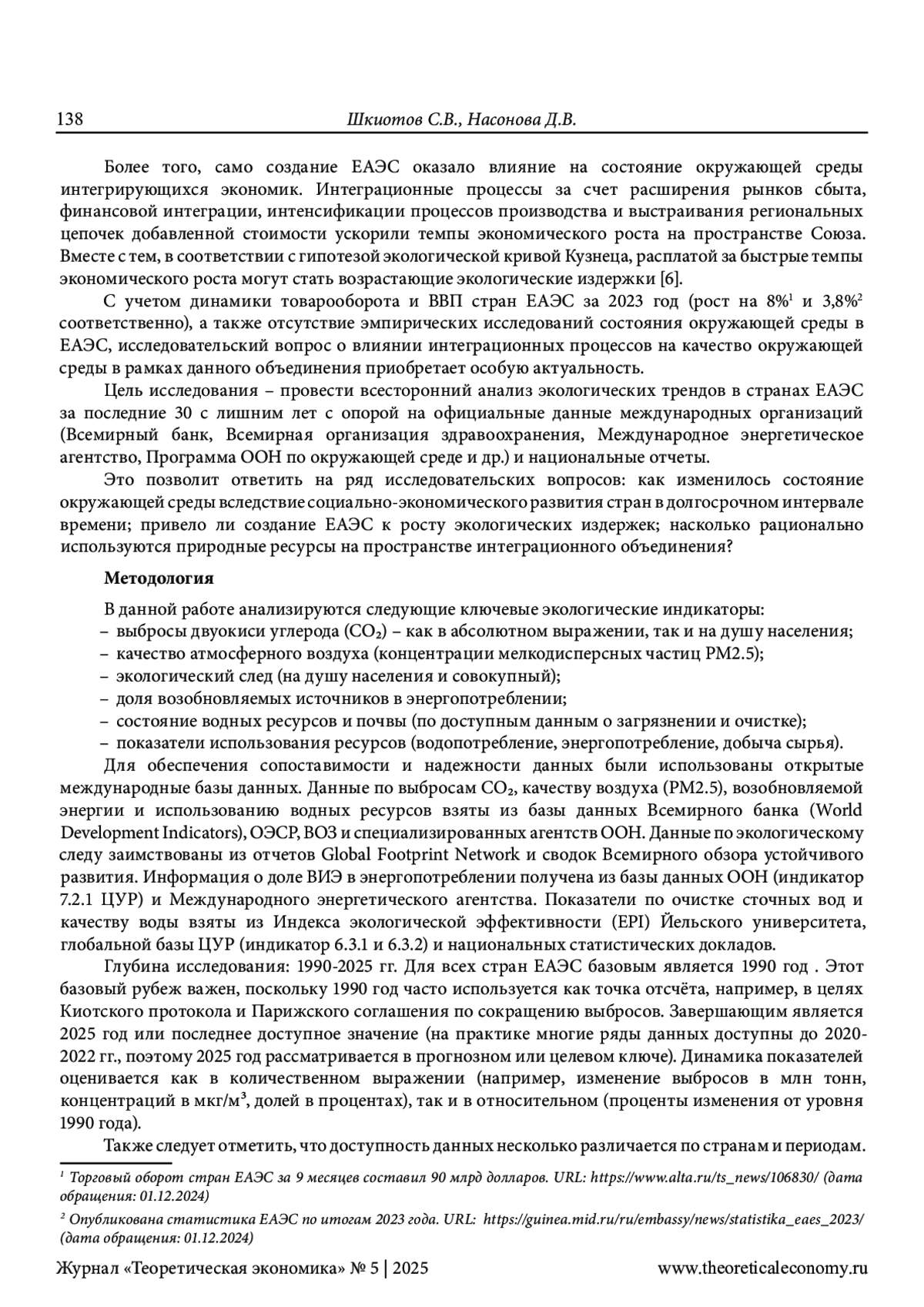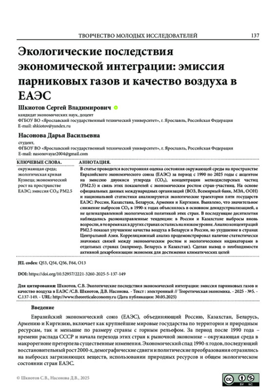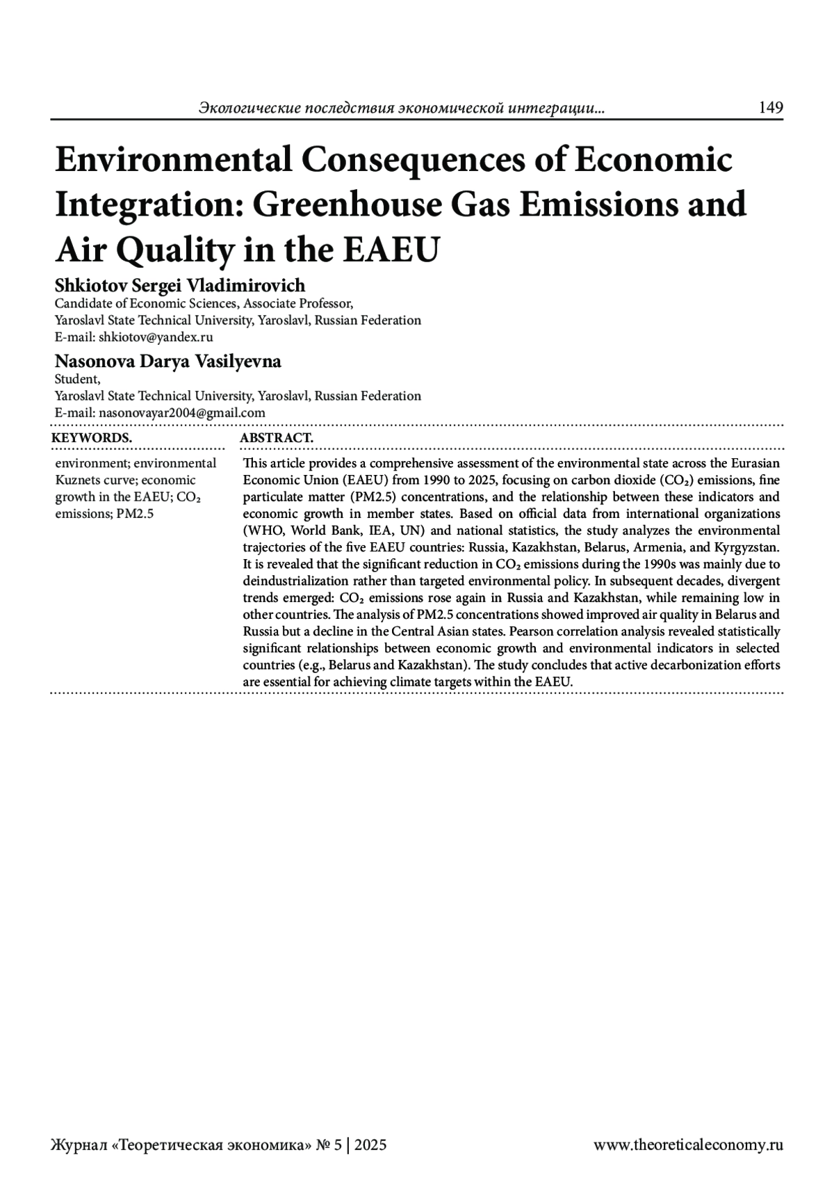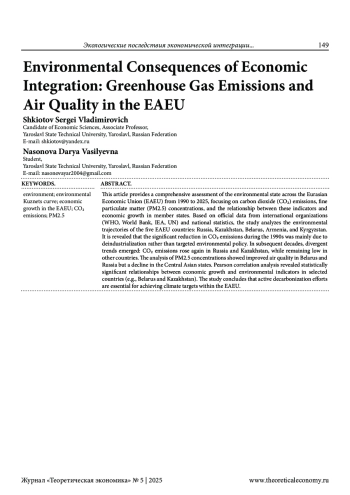 В статье проводится всесторонняя оценка состояния окружающей среды на пространстве Евразийского экономического союза (ЕАЭС) за период с 1990 по 2025 годы с акцентом на эмиссию двуокиси углерода (CO₂), концентрации мелкодисперсных частиц (PM2.5) и связь этих показателей с экономическим ростом стран-участниц. На основе официальных данных международных организаций (ВОЗ, Всемирный банк, МЭА, ООН) и национальной статистики анализируются экологические траектории пяти государств ЕАЭС: России, Казахстана, Беларуси, Армении и Киргизии. Выявлено, что значительное снижение выбросов CO₂ в 1990-х годах объяснялось в основном деиндустриализацией, а не целенаправленной экологической политикой этих стран. В последующие десятилетия наблюдались разнонаправленные тенденции: в России и Казахстане выбросы вновь возросли, в то время как в других странах остались на низком уровне. Анализ концентраций PM2.5 показал улучшение качества воздуха в Беларуси и России, но ухудшение в странах Центральной Азии. Корреляционный анализ продемонстрировал наличие статистически значимых связей между экономическим ростом и экологическими индикаторами в отдельных странах (например, Беларусь и Казахстан). Сделан вывод о необходимости активной декарбонизации экономик для достижения климатических целей