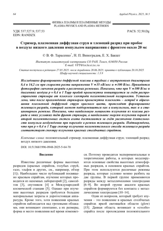 Исследовано формирование диффузной плазмы в трубках с внутренними диаметрами 8,4 и 14,2 см при скорости роста напряжения V 35 кВ/мкс и 100 В/мс. Приводятся фотографии свечения разряда в различных режимах. Показано, что при V 100 В/мс и давлениях воздуха p = 0,4 и 1 Торр пробой промежутка инициируется за счёт распро-странения стримера от плоского электрода положительной полярности. Установлено, что после прохождения стримером промежутка плоскость – остриё и образо-вания плазменной диффузной струи красного цвета, происходит формирование тле-ющего разряда, который может поддерживаться как в импульсном, так и в стационарном режиме. Показано, что наибольшую мощность излучения из плазмы разряда в этих условиях даёт фронт стримера, а наибольшие энергии излучения первой и вто-рой положительных систем азота достигаются за счёт увеличения длительности импульса возбуждения при переходе в режим тлеющего разряда. Подтверждено, что при p = 0,4 и 1 Торр спектр излучения положительного столба тлеющего разряда соответствует спектру излучения красных столбчатых спрайтов.