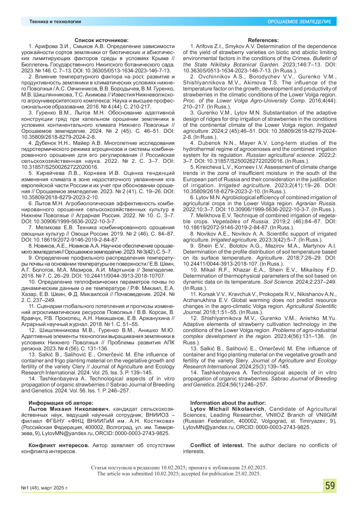 3. Гуренко В.М., Лытов М.Н. Обоснование адаптивной конструкции гряд при капельном орошении земляники в условиях континентального климата Нижнего Поволжья // Орошаемое земледелие. 2024. № 2 (45). С. 46-51. DOI: 10.35809/2618-8279-2024-2-8