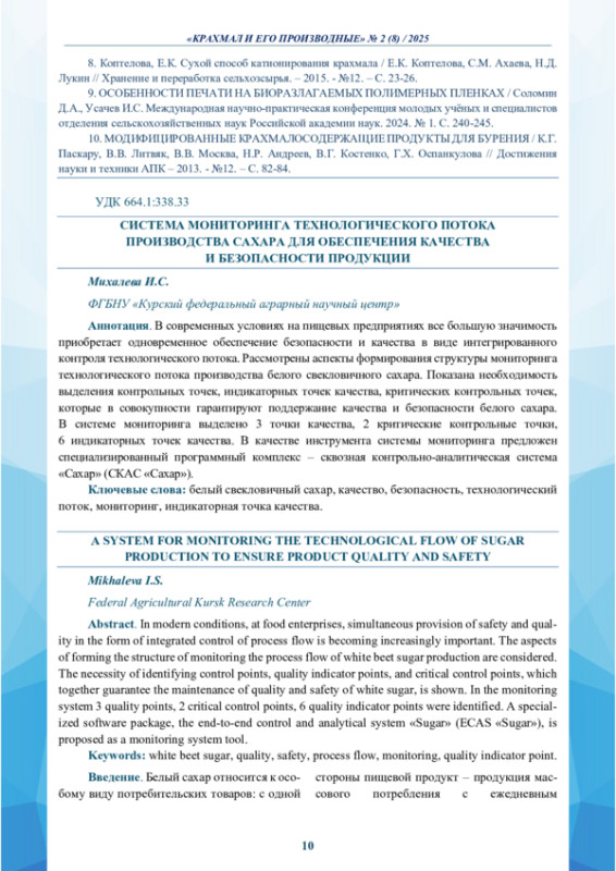 5. Егорова М. И. Организация системы контроля технологического потока производства сахара: современный подход / М. И. Егорова // Наука, питание и здоровье: сб. науч. тр. / Научно - практический центр Нан Беларуси по продовольствию. - Минск: Беларуская наука, - 2022. - С. 9-17.