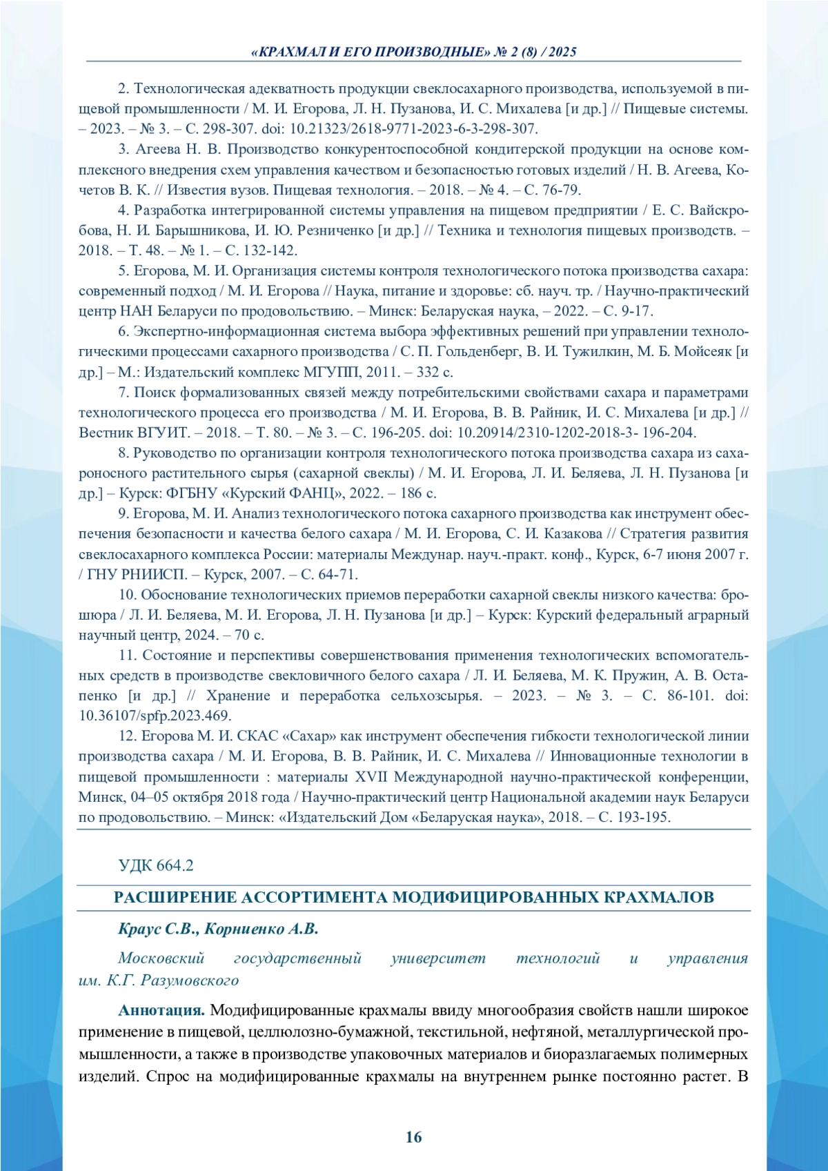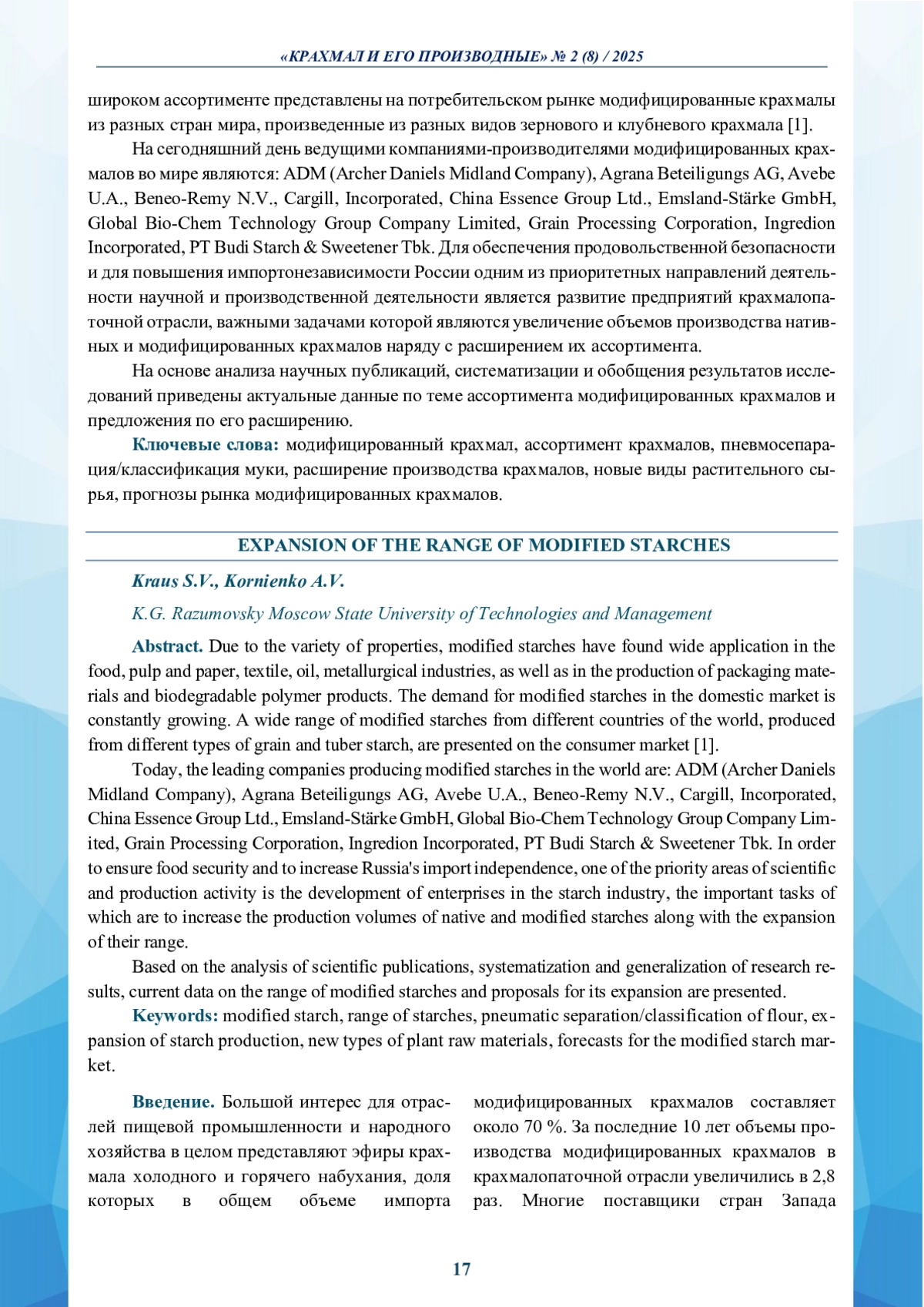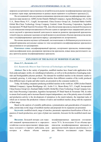 КРАУС С. В., КОРНИЕНКО А. В. РАСШИРЕНИЕ АССОРТИМЕНТА МОДИФИЦИРОВАННЫХ КРАХМАЛОВ // КРАХМАЛ И ЕГО ПРОИЗВОДНЫЕ. 2025. № 2 (8)