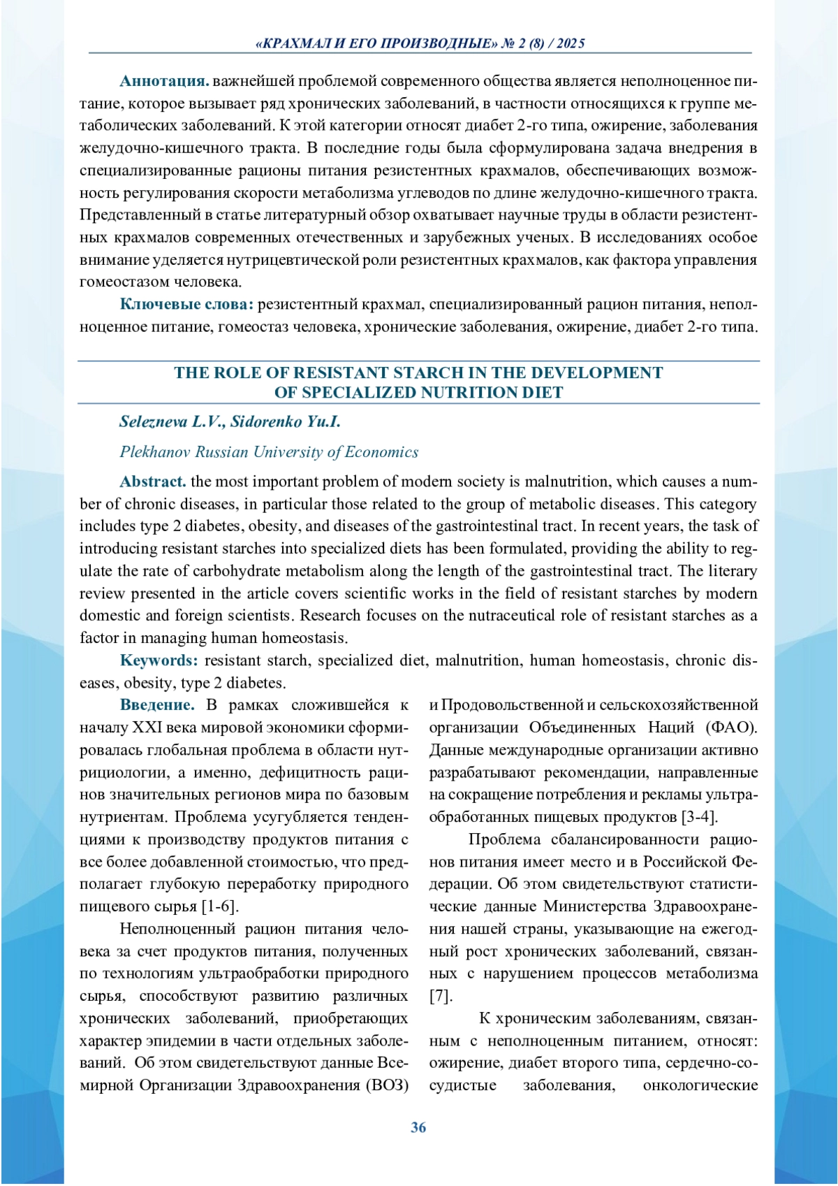 важнейшей проблемой современного общества является неполноценное питание, которое вызывает ряд хронических заболеваний, в частности относящихся к группе метаболических заболеваний. К этой категории относят диабет 2-го типа, ожирение, заболевания желудочно-кишечного тракта. В последние годы была сформулирована задача внедрения в специализированные рационы питания резистентных крахмалов, обеспечивающих возможность регулирования скорости метаболизма углеводов по длине желудочно-кишечного тракта. Представленный в статье литературный обзор охватывает научные труды в области резистентных крахмалов современных отечественных и зарубежных ученых. В исследованиях особое внимание уделяется нутрицевтической роли резистентных крахмалов, как фактора управления гомеостазом человека.