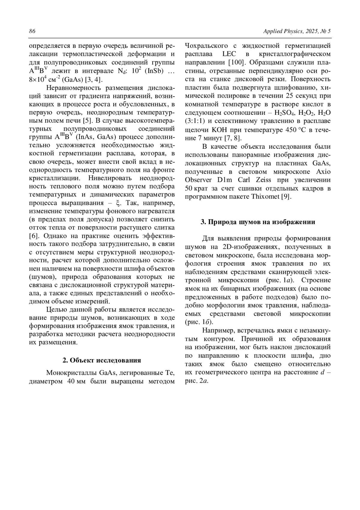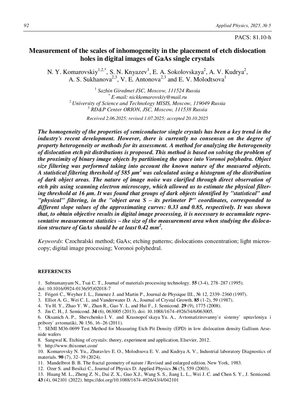 The homogeneity of the properties of semiconductor single crystals has been a key trend in the industry’s recent development. However, there is currently no consensus on the degree of property heterogeneity or methods for its assessment. A method for analyzing the heteroge-neity of dislocation etch pit distributions is proposed. This method is based on solving the problem of the proximity of binary image objects by partitioning the space into Voronoi poly-hedra. Object size filtering was performed taking into account the known nature of the meas-ured objects. A statistical filtering threshold of 585 μm2 was calculated using a histogram of the distribu-tion of dark object areas. The nature of image noise was clarified through direct observation of etch pits using scanning electron microscopy, which allowed us to estimate the physical fil-tering threshold at 16 μm. It was found that groups of dark objects identified by “statistical” and “physical” filtering, in the “object area S – its perimeter P” coordinates, corresponded to different slope values of the approximating curves: 0.33 and 0.85, respectively. It was shown that, to obtain objective results in digital image processing, it is necessary to accumulate rep-resentative measurement statistics – the size of the measurement area when studying the dis-location structure of GaAs should be at least 0.42 mm2.