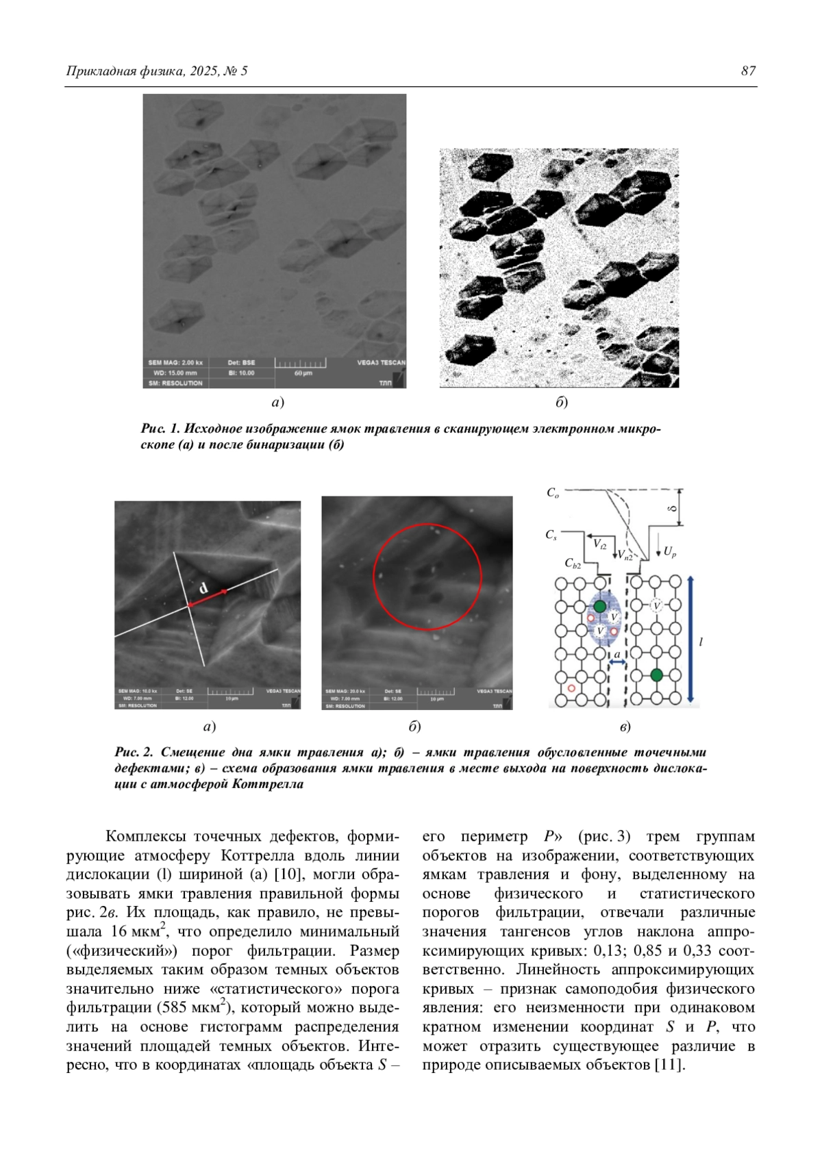 . На основе статистики распределения площадей темных объектов для исследуемого в работе панорамного изображения определен порог фильтрации шумов – 585 мкм2. Показа-но, что группам темных объектов, выделяемых «статистической» (на основе гистограмм распределения значений площадей) и «физи-ческой» (по прямым наблюдениям морфологии ямок травления в сканирующем электронном микроскопе) фильтрацией, в координатах «площадь объекта S – его периметр P», отвечали различные значения тангенсов углов наклона аппроксимирующих кривых: 0,33 и 0,85 соответственно.