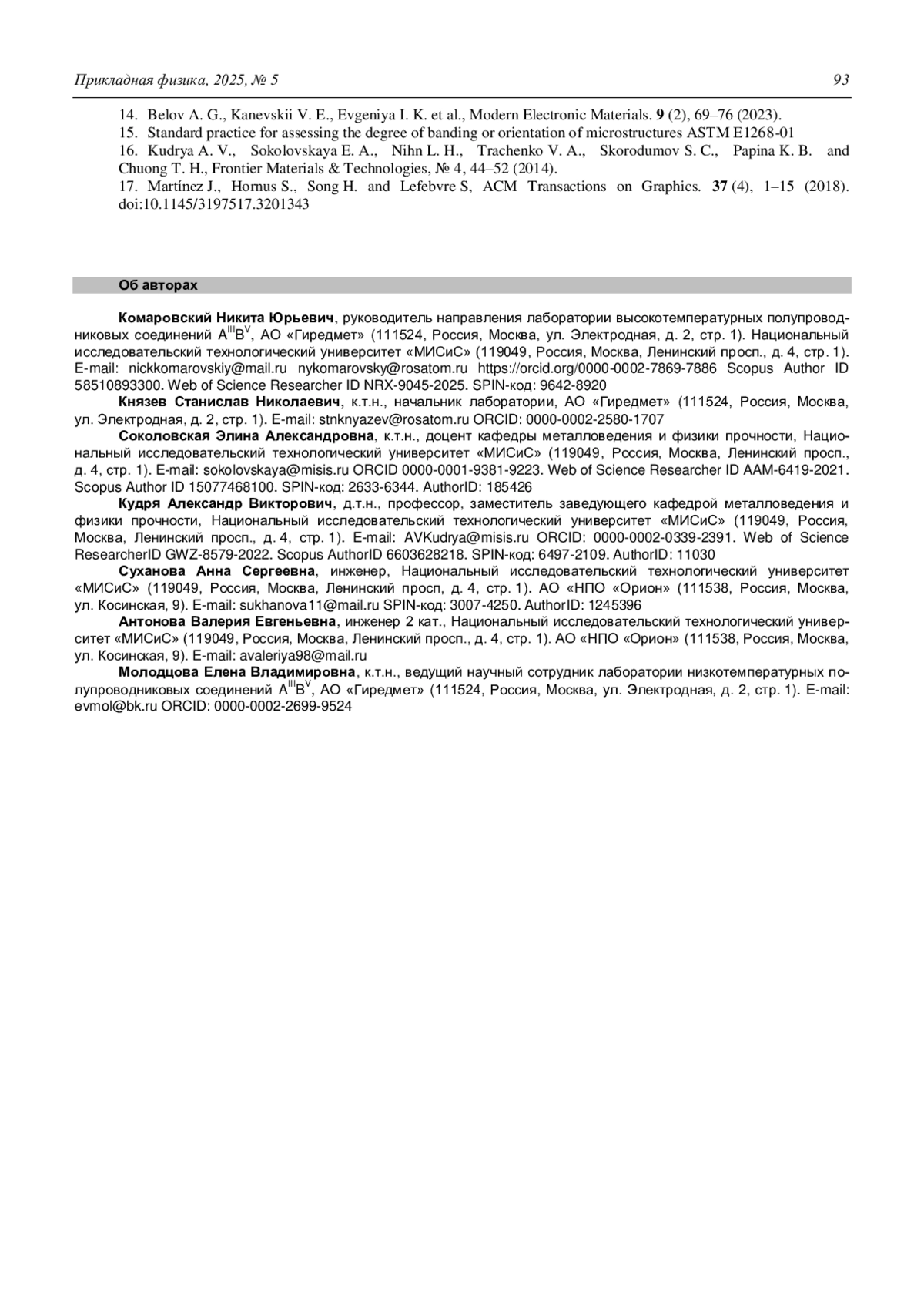 - Komarovsky N. Yu., Zhuravlev E. O., Mo-lodtsova E. V., Kudrya A. V. / Industrial laboratory Diag-nostics of materials. 2024. Vol. 90 (7). P. 32–39.