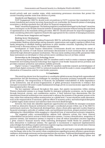 The modern world economy is going through a fundamental paradigm change from a unipolar group led, liberal international order in the United States to a multipolar order characterized by geoeconomic blocs competing with one another. This shift provides emerging economies with both unprecedented opportunities and systemic risks to pursue sustainable pathways to growth. This article examines the role of BRICS (Brazil, Russia, India, China, South Africa) as the main institutional mechanism to create alternative geoeconomic frameworks that enhance financial security in support of sustainable development. Using a mix of interdisciplinary analysis that draws from historical context, theoretical approaches drawn from international political economy, and analysis of contemporary policy, we identify three major questions faced by multipolar economies: (1) financial weaponization and dependence on the dollar (or dependence on the dollar), (2) fragmentation of global governance, and (3) asymmetric vulnerabilities to external shocks. We propose a comprehensive policy framework with three pillars toward financial sovereignty, resilient trading networks, and strengthened multilateral institutions. Overall findings suggest that passive participation (or integration) into existing Western-led systems is no longer feasible for emerging economies. Sustainable development requires active geoeconomic policy strategies that use BRICS+ frameworks to diversify currencies, create alternative financing frameworks, and develop coordinated policy responses. The article proposes a set of actionable items for policymakers in emerging multipolar economies, as well as a need for strategic autonomy without complete decoupling from the global market.