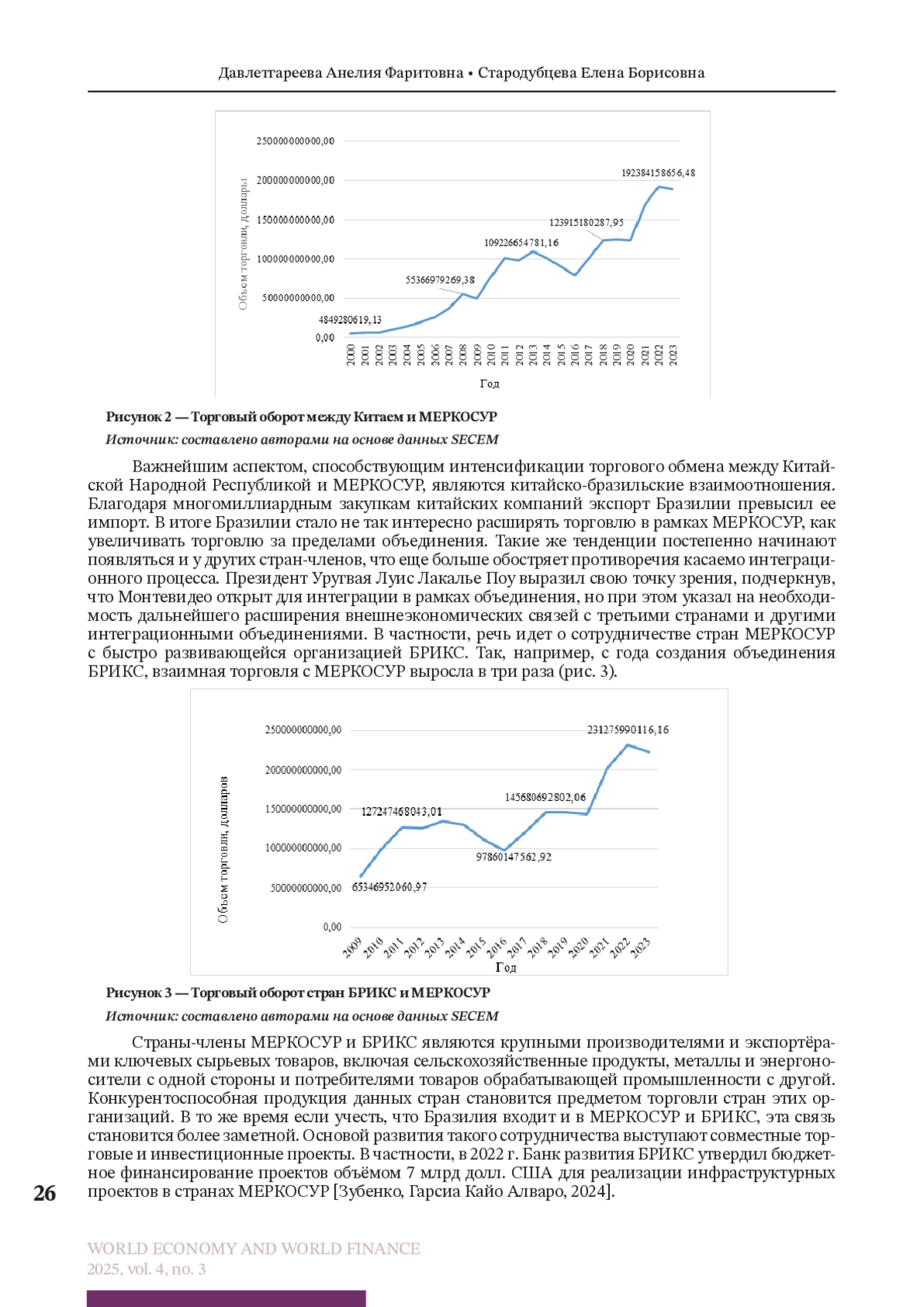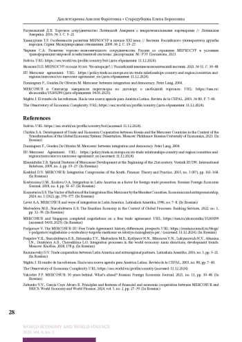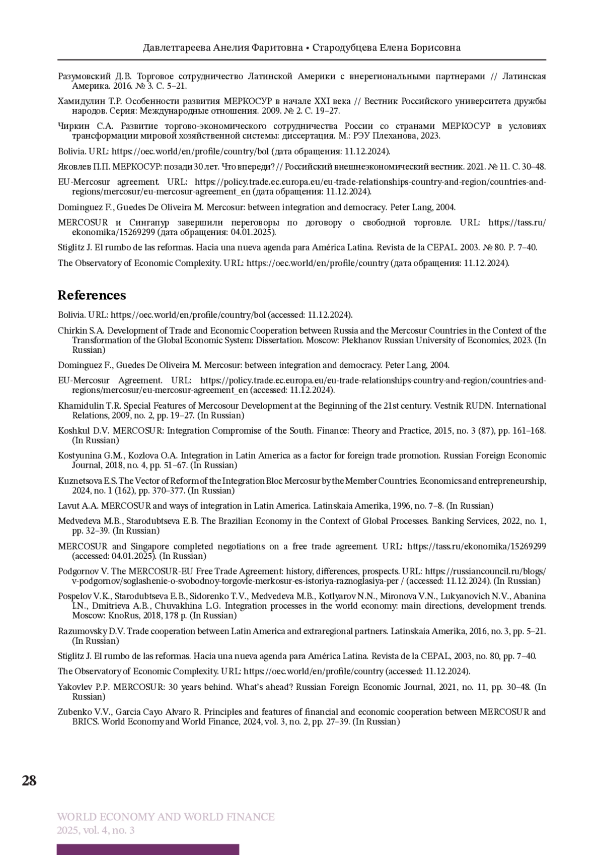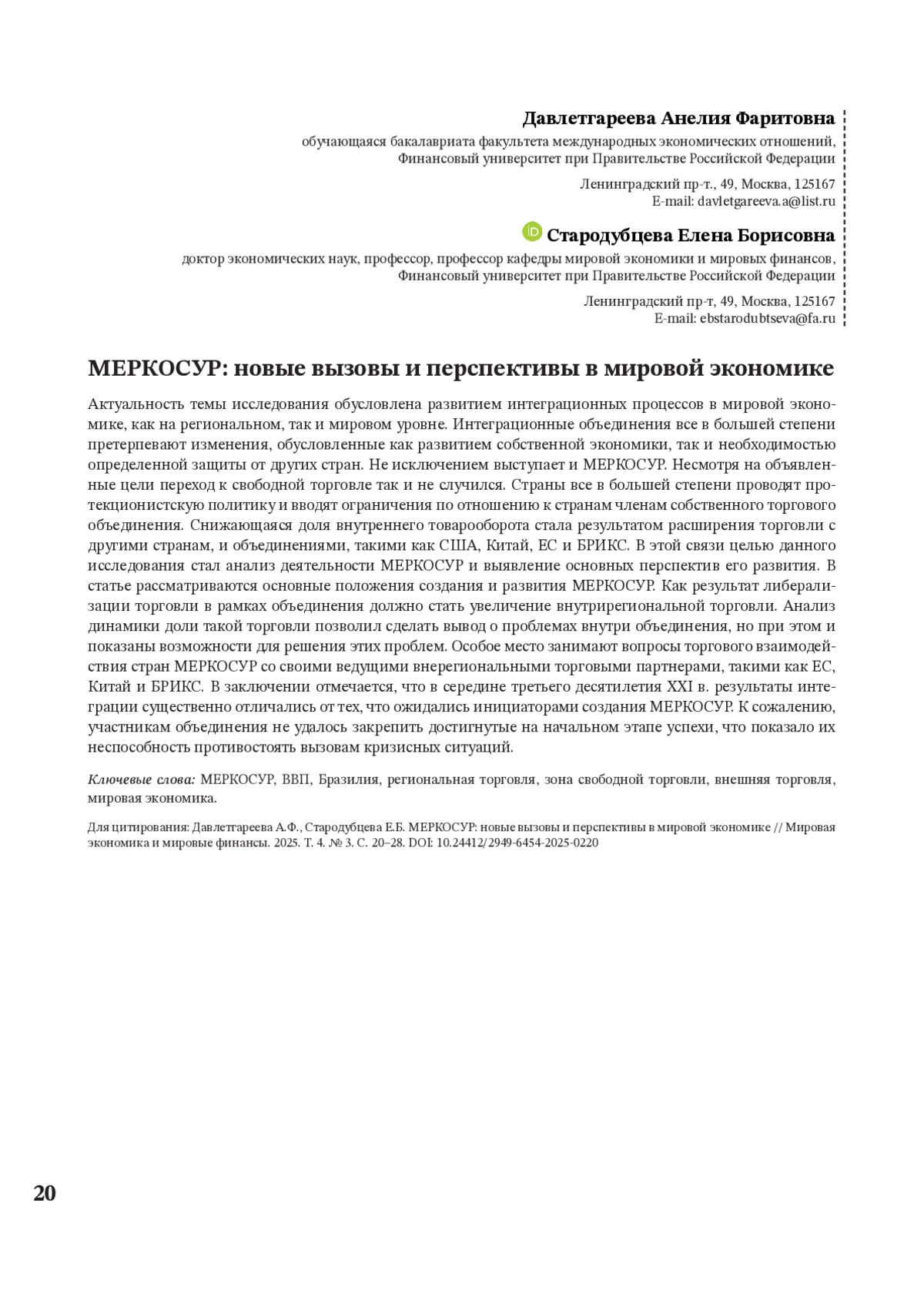 ДАВЛЕТГАРЕЕВА А. Ф., СТАРОДУБЦЕВА Е. Б. МЕРКОСУР: НОВЫЕ ВЫЗОВЫ И ПЕРСПЕКТИВЫ В МИРОВОЙ ЭКОНОМИКЕ // МИРОВАЯ ЭКОНОМИКА И МИРОВЫЕ ФИНАНСЫ. 2025. № 3, ТОМ 4
