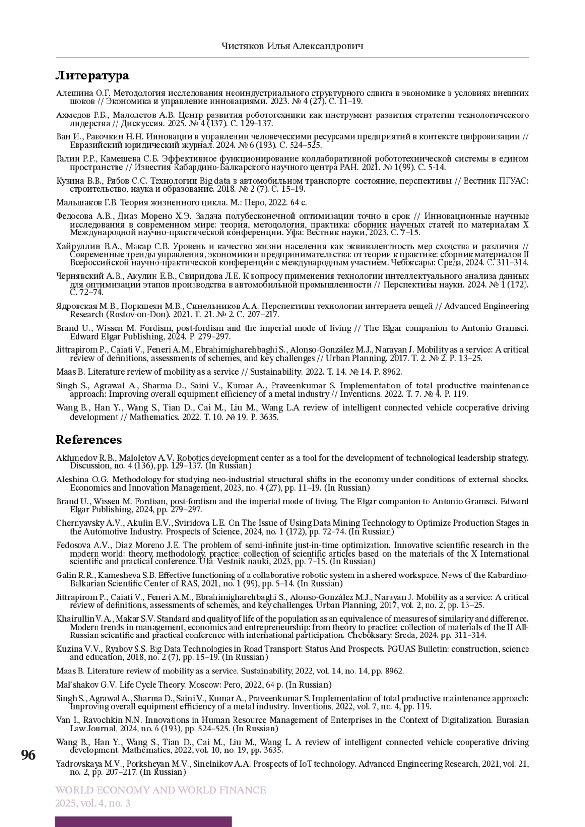 ЧИСТЯКОВ И. А. РАЗРАБОТКА ДИНАМИЧЕСКОЙ СИСТЕМЫ ЦИФРОВОЙ КОНКУРЕНТОСПОСОБНОСТИ АВТОПРОМА // МИРОВАЯ ЭКОНОМИКА И МИРОВЫЕ ФИНАНСЫ. 2025. № 3, ТОМ 4