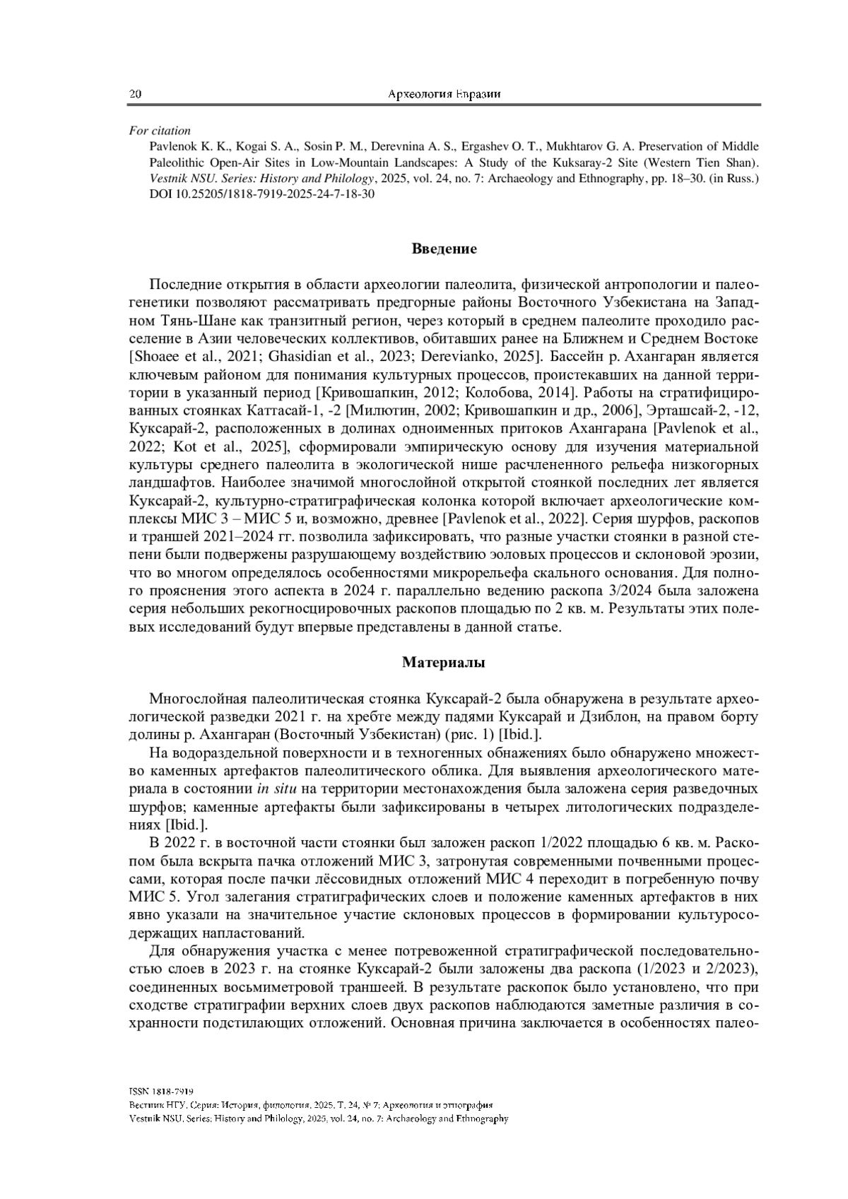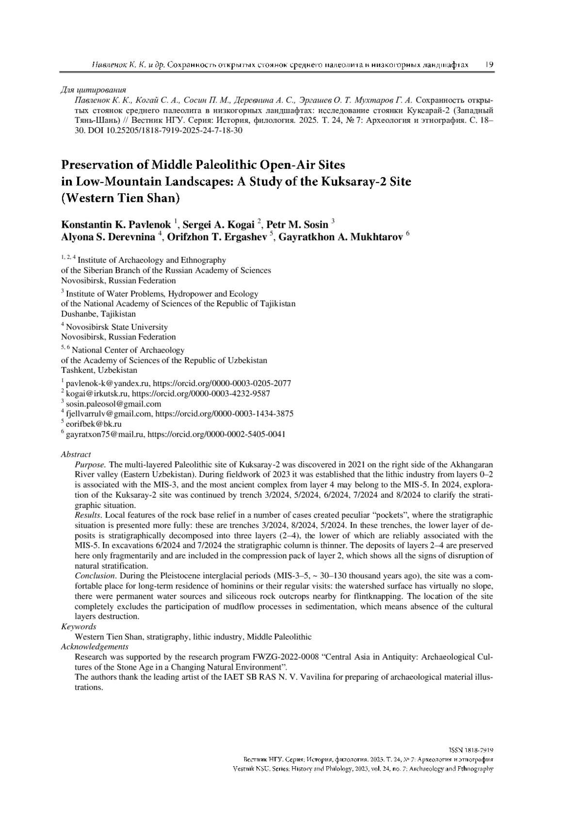 12. Kot M., Kogai S., Pavlenok G., Gryczewska N., Brancaleoni G., Krajcarz M. T., Moska P., Leloch M., Khudjanazarov M., Szymczak K., Muhtarov G., Pavlenok K. New Data for Asymmetric Core Reduction in Western Tian Shan Piedmonts: The Ertash Sai 2 Open-Air Site // Lithic Technology. 2025. Vol. 50, iss. 1. P. 1-2. https://doi.org/10.1080/01977261.2024.2319429