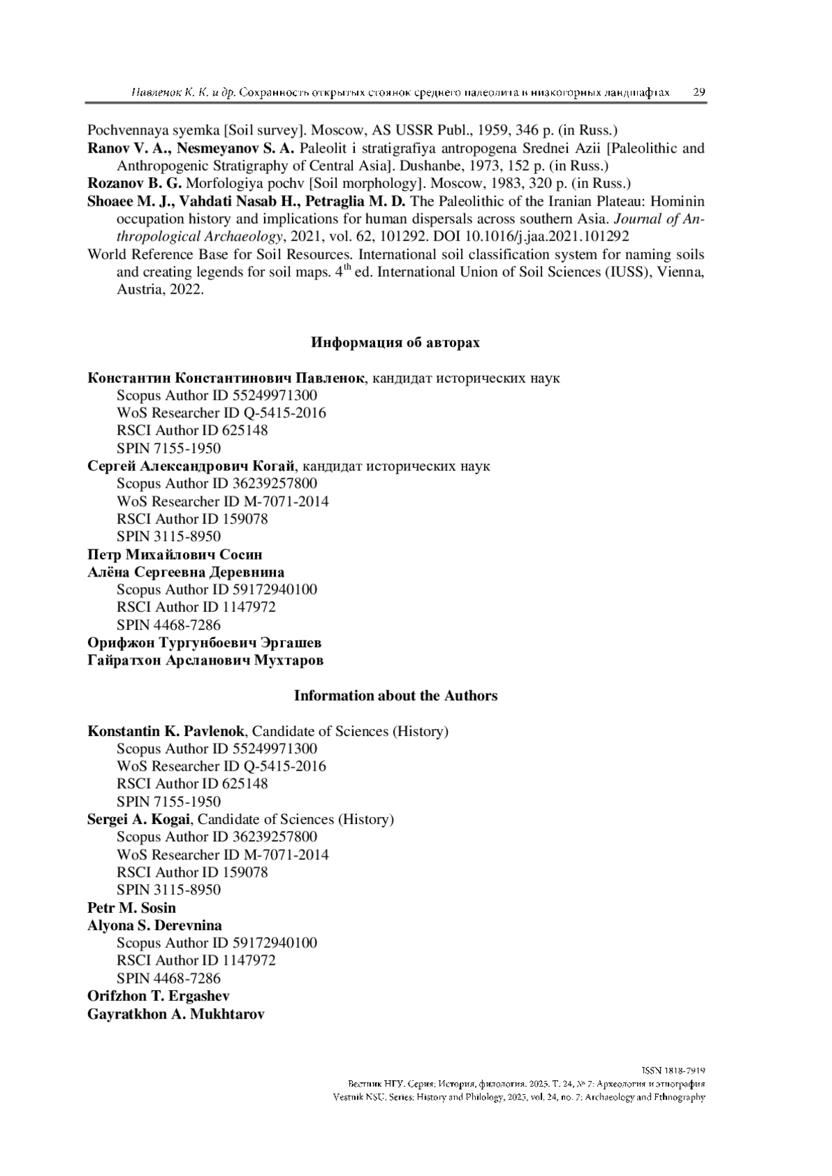 15. Pavlenok K., Kot M., Moska P., Leloch M., Muhtarov G., Kogai S., Khudjanazarov M., Holmatov A., Szymczak K. New evidence for mountain Palaeolithic human occupation in the western Tian Shan piedmonts, eastern Uzbekistan // Antiquity Project Gallery. 2022. Vol. 96 (389). P. 1292-1300. https://doi.org/10.15184/aqy.2022.99