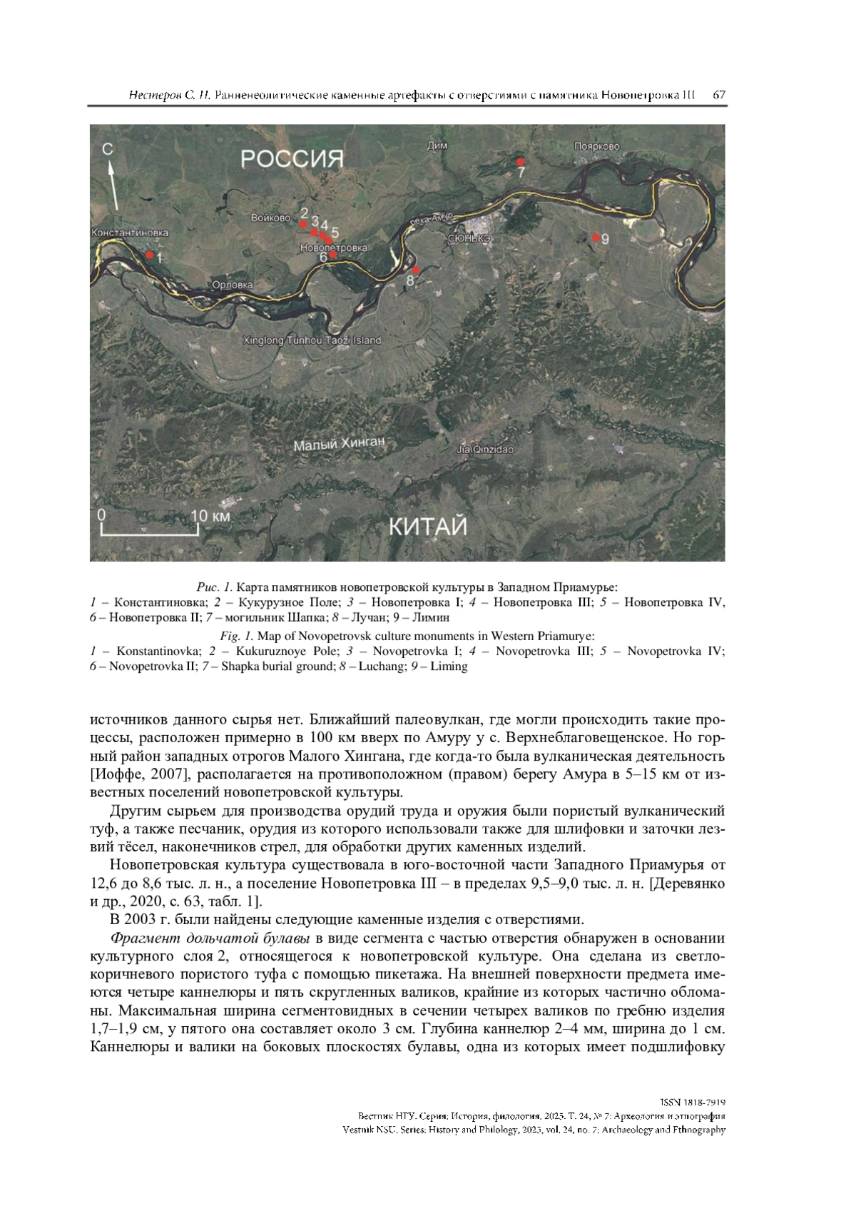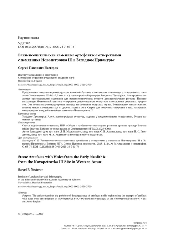 Представлены описания и реконструкции каменной булавы с каннелюрами и пуговицы с отверстиями с поселения Новопетровка III (9,5–9,0 тыс. л. н.) новопетровской культуры Западного Приамурья. Эти предметы являются оригинальными изделиями для ранненеолитических культур дальневосточного региона. Наличие в коллекции бракованной плитки с отверстием свидетельствует о местном изготовлении сверленых предметов. Она позволила реконструировать процесс изготовления округлых грузил. Большинство новопетровских пуговиц могли изготавливаться из дерева, кости и рога. Сверла для получения отверстий в этих материалах присутствуют в орудийном наборе памятника Новопетровка III.