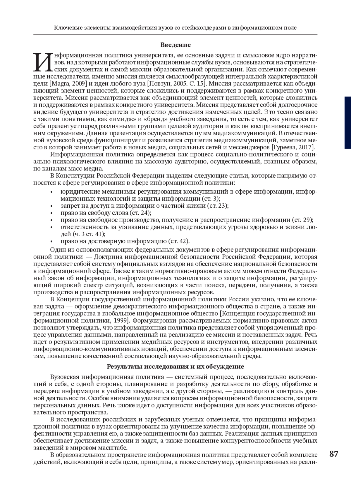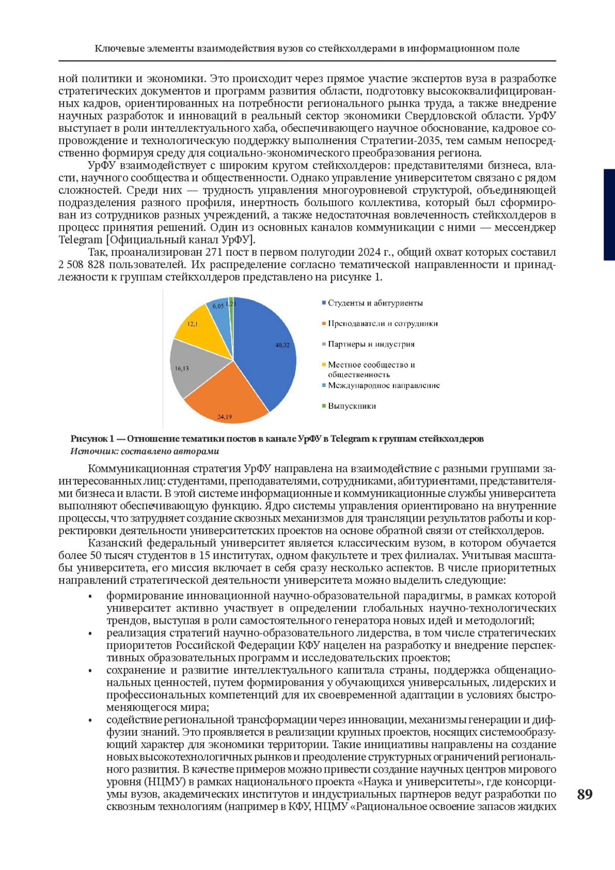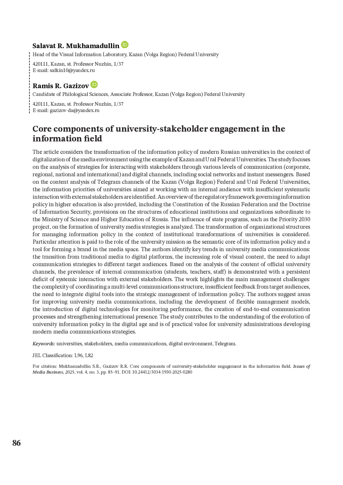 В статье рассматривается трансформация информационной политики современных российских университетов в условиях цифровизации медиасреды на примере Казанского и Уральского федеральных университетов. Исследование фокусируется на анализе стратегий взаимодействия со стейкхолдерами через различные уровни коммуникации (корпоративный, региональный, национальный и международный) и цифровые каналы, включая социальные сети и мессенджеры. На основе контент-анализа Telegram-каналов Казанского (Приволжского) федерального и Уральского федерального университетов выявлены информационные приоритеты вузов, направленные на работу с внутренней аудиторией при недостаточной системности взаимодействия с внешними стейкхолдерами. Также представлен обзор нормативно-правовой базы, регулирующей информационную политику в сфере высшего образования, включая Конституцию России и Доктрину информационной безопасности, положения о структурах образовательных учреждений и организаций, подведомственных Министерству науки и высшего образования России. Анализируется влияние государственных инициатив, например, составной части национального проекта «Наука и университеты» программы «Приоритет 2030», на формирование медиастратегий университетов. Рассматривается трансформация организационных структур управления информационной политикой в условиях институциональных преобразований вузов. Особое внимание уделяется роли миссии университета как смыслового ядра его информационной политики и инструмента формирования бренда в медиапространстве. Авторы выявляют ключевые тенденции в медиакоммуникациях вузов: переход от традиционных медиа к цифровым платформам, усиление роли визуального контента, необходимость адаптации коммуникационных стратегий под различные целевые аудитории. На основе анализа контента официальных университетских каналов демонстрируется преобладание внутренней коммуникации (студенты, преподаватели, сотрудники) при сохраняющемся дефиците системного взаимодействия с внешними стейкхолдерами. В работе подчеркиваются основные управленческие вызовы: сложность координации многоуровневой структуры коммуникаций, недостаточная обратная связь от целевых аудиторий, необходимость интеграции цифровых инструментов в стратегическое управление информационной политикой. Авторы предлагают направления совершенствования университетских медиакоммуникаций, включая развитие гибких моделей управления, внедрение цифровых технологий мониторинга эффективности, создание сквозных коммуникационных процессов и усиление международного присутствия. Исследование вносит вклад в понимание эволюции информационной политики вузов в цифровую эпоху и представляет практическую ценность для администраций университетов, разрабатывающих современные стратегии медиакоммуникаций.