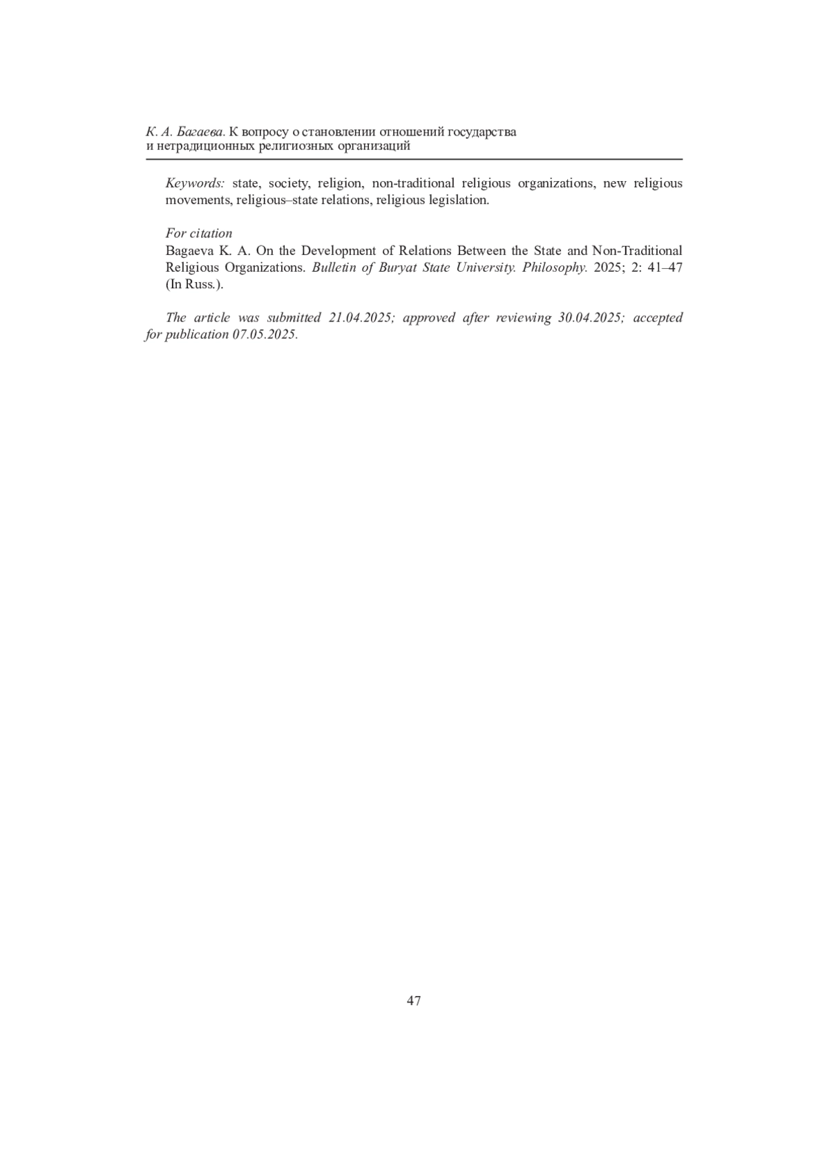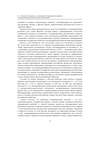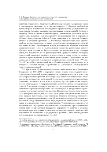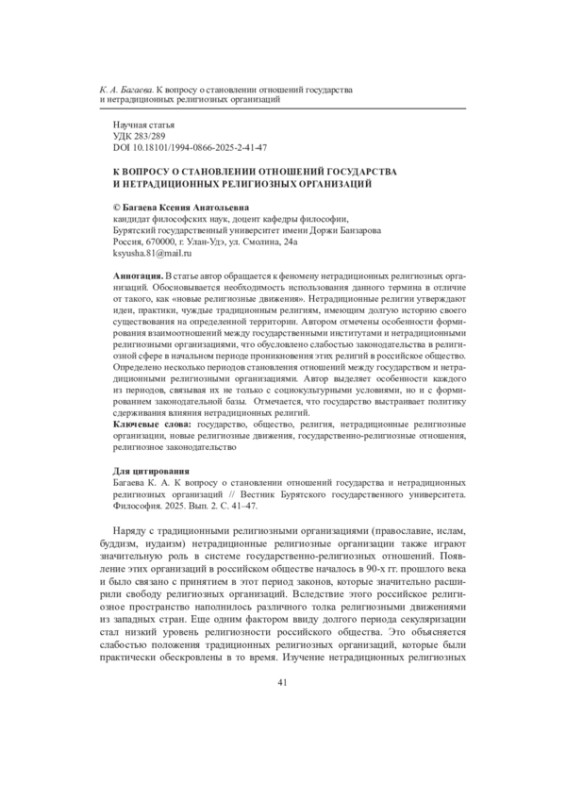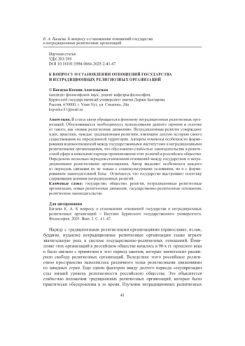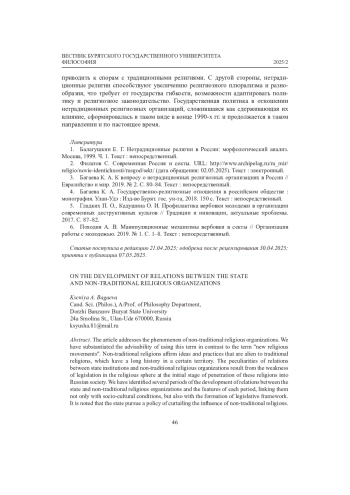 В статье автор обращается к феномену нетрадиционных религиозных организаций. Обосновывается необходимость использования данного термина в отличие от такого, как «новые религиозные движения». Нетрадиционные религии утверждают идеи, практики, чуждые традиционным религиям, имеющим долгую историю своего существования на определенной территории. Автором отмечены особенности формирования взаимоотношений между государственными институтами и нетрадиционными религиозными организациями, что обусловлено слабостью законодательства в религиозной сфере в начальном периоде проникновения этих религий в российское общество. Определено несколько периодов становления отношений между государством и нетрадиционными религиозными организациями. Автор выделяет особенности каждого из периодов, связывая их не только с социокультурными условиями, но и с формированием законодательной базы. Отмечается, что государство выстраивает политику сдерживания влияния нетрадиционных религий.