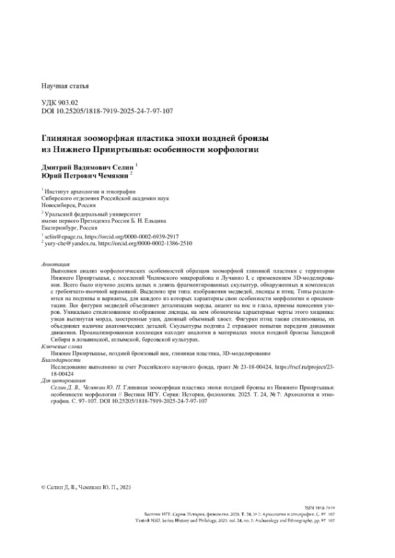 Выполнен анализ морфологических особенностей образцов зооморфной глиняной пластики с территории Нижнего Прииртышья, с поселений Чилимского микрорайона и Лучкино I, с применением 3D-моделирования. Всего было изучено десять целых и девять фрагментированных скульптур, обнаруженных в комплексах с гребенчато-ямочной керамикой. Выделено три типа: изображения медведей, лисицы и птиц. Типы разделяются на подтипы и варианты, для каждого из которых характерны свои особенности морфологии и орнаментации. Все фигурки медведей объединяет детализация морды, акцент на нос и глаза, приемы нанесения узоров. Уникально стилизованное изображение лисицы, на нем обозначены характерные черты этого хищника: узкая вытянутая морда, заостренные уши, длинный объемный хвост. Фигурки птиц также стилизованы, их объединяет наличие анатомических деталей. Скульптуры подтипа 2 отражают попытки передачи динамики движения. Проанализированная коллекция находит аналогии в материалах эпохи поздней бронзы Западной Сибири в лозьвинской, атлымской, барсовской культурах.