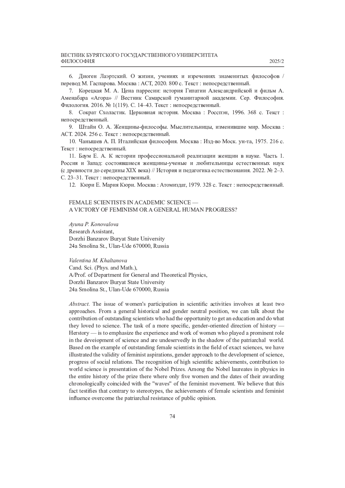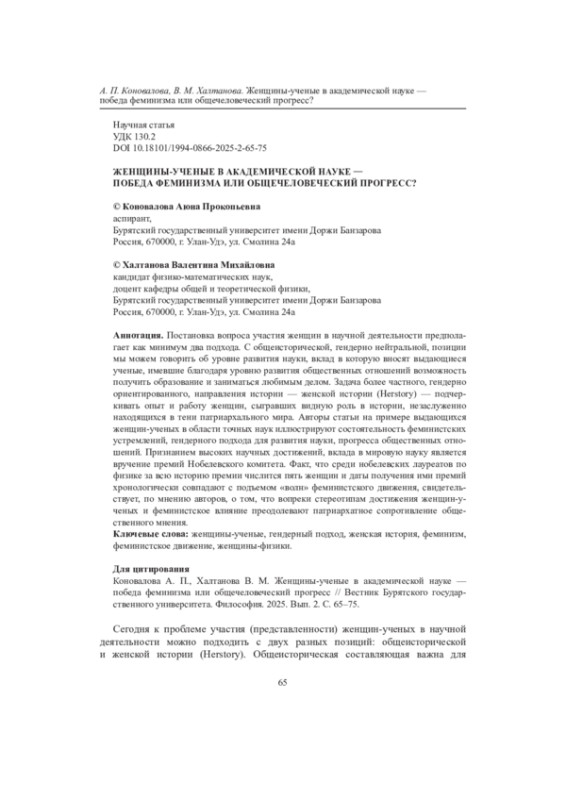 Постановка вопроса участия женщин в научной деятельности предполагает как минимум два подхода. С общеисторической, гендерно нейтральной, позиции мы можем говорить об уровне развития науки, вклад в которую вносят выдающиеся ученые, имевшие благодаря уровню развития общественных отношений возможность получить образование и заниматься любимым делом. Задача более частного, гендерно ориентированного, направления истории - женской истории (Herstory) - подчеркивать опыт и работу женщин, сыгравших видную роль в истории, незаслуженно находящихся в тени патриархального мира. Авторы статьи на примере выдающихся женщин-ученых в области точных наук иллюстрируют состоятельность феминистских устремлений, гендерного подхода для развития науки, прогресса общественных отношений. Признанием высоких научных достижений, вклада в мировую науку является вручение премий Нобелевского комитета. Факт, что среди нобелевских лауреатов по физике за всю историю премии числится пять женщин и даты получения ими премий хронологически совпадают с подъемом «волн» феминистского движения, свидетельствует, по мнению авторов, о том, что вопреки стереотипам достижения женщин-у-ченых и феминистское влияние преодолевают патриархатное сопротивление общественного мнения.