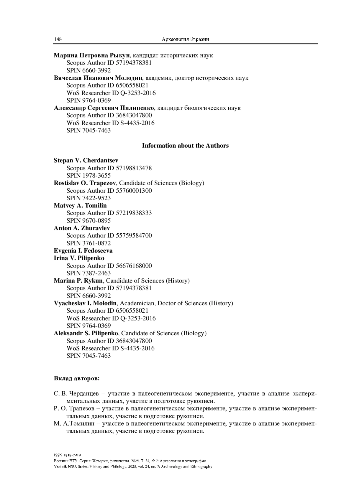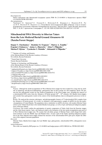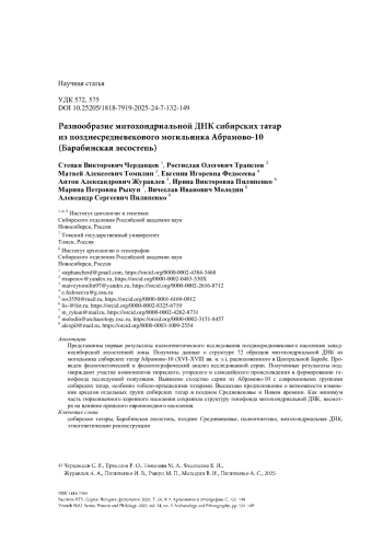 ЧЕРДАНЦЕВ С. В., ТРАПЕЗОВ Р. О., ТОМИЛИН М. А., ФЕДОСЕЕВА Е. И., ЖУРАВЛЕВ А. А., ПИЛИПЕНКО И. В., РЫКУН М. П., МОЛОДИН В. И., ПИЛИПЕНКО А. С. РАЗНООБРАЗИЕ МИТОХОНДРИАЛЬНОЙ ДНК СИБИРСКИХ ТАТАР ИЗ ПОЗДНЕСРЕДНЕВЕКОВОГО МОГИЛЬНИКА АБРАМОВО-10 (БАРАБИНСКАЯ ЛЕСОСТЕПЬ) // ВЕСТНИК НГУ. СЕРИЯ: ИСТОРИЯ, ФИЛОЛОГИЯ. 2025. ТОМ 24, № 7