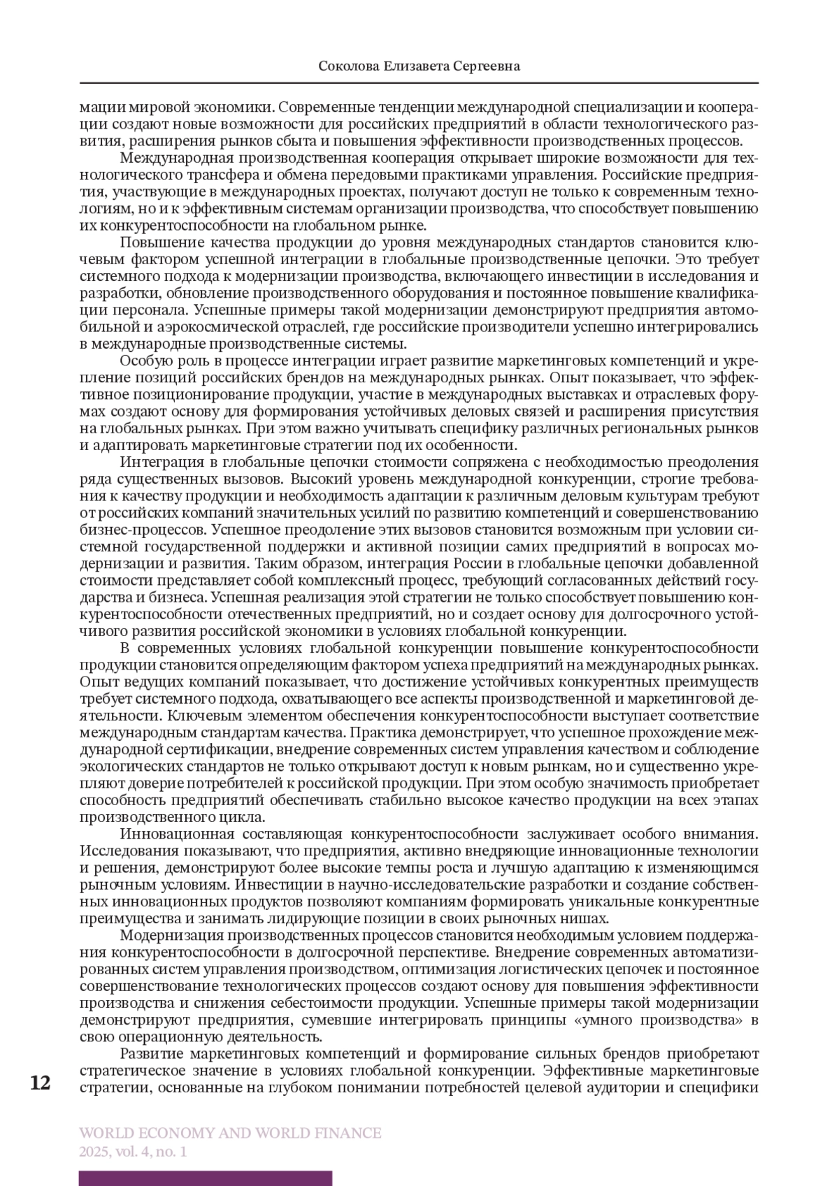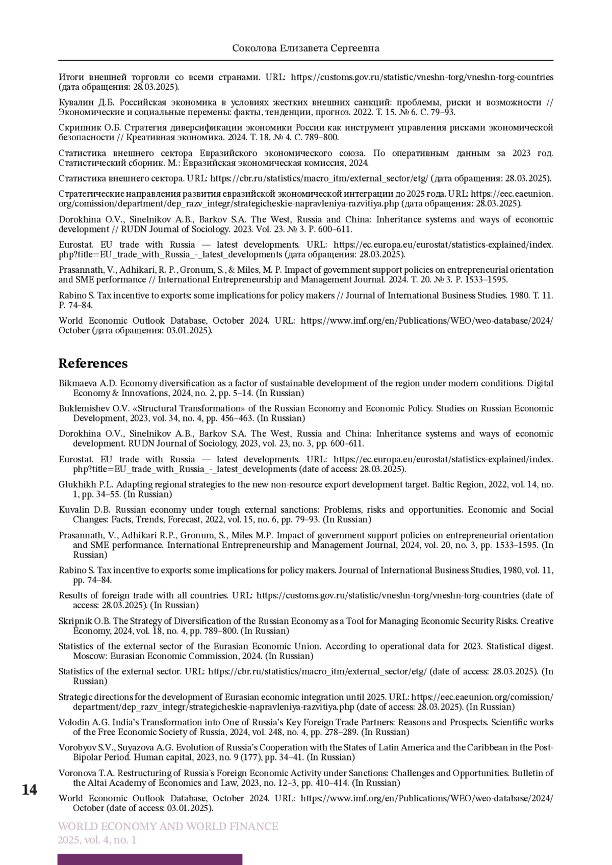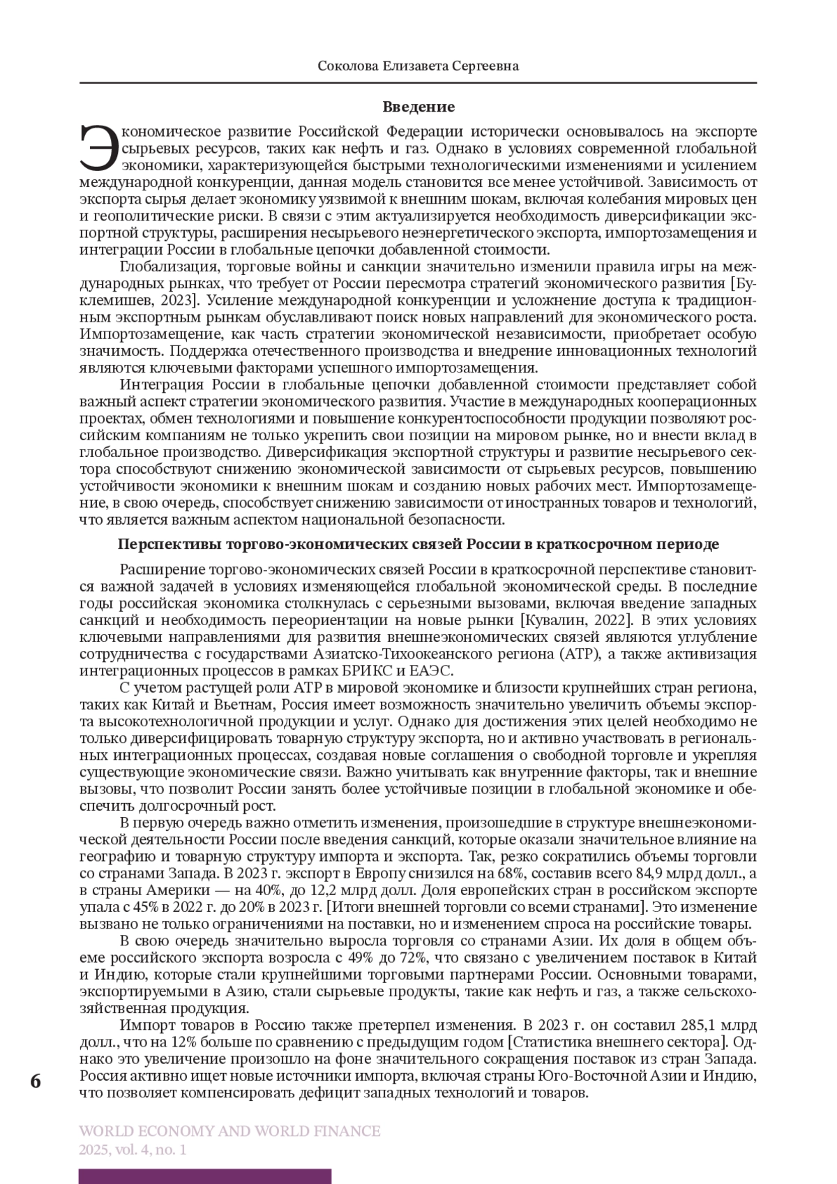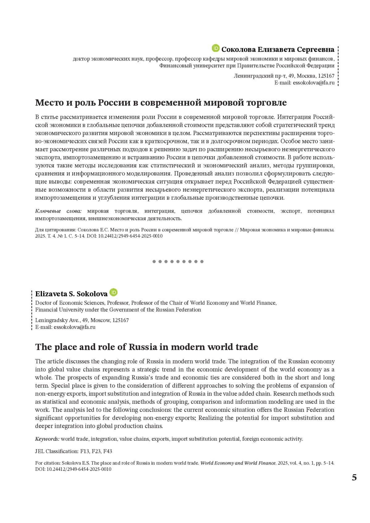 СОКОЛОВА Е. С. МЕСТО И РОЛЬ РОССИИ В СОВРЕМЕННОЙ МИРОВОЙ ТОРГОВЛЕ // МИРОВАЯ ЭКОНОМИКА И МИРОВЫЕ ФИНАНСЫ. 2025. № 1, ТОМ 4