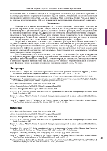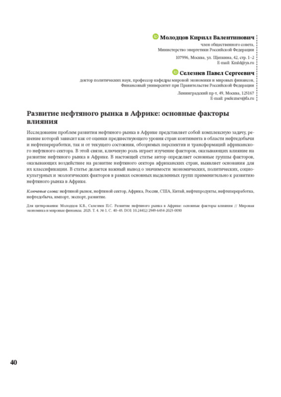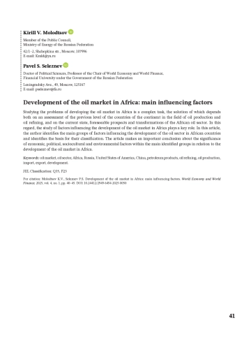 МОЛОДЦОВ К. В., СЕЛЕЗНЕВ П. С. РАЗВИТИЕ НЕФТЯНОГО РЫНКА В АФРИКЕ: ОСНОВНЫЕ ФАКТОРЫ ВЛИЯНИЯ // МИРОВАЯ ЭКОНОМИКА И МИРОВЫЕ ФИНАНСЫ. 2025. № 1, ТОМ 4