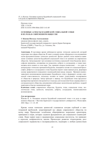 В настоящее время наблюдается кризис этических ценностей, который затрагивает все сферы общества. В таких условиях нужно обращаться к исследованиям основ фундаментальных этических ценностей. Целью данной статьи является выявление основных аспектов буддийской социальной этики и их влияние на современное общество. Автор выделяет три основных источника социальной этики буддизма: философские принципы, основанные на ненасилии, доброте и сострадании, а также взаимосвязь всего живого в этом мире. Так, принцип ахимсы (ненасилия) - это один из центральных этических принципов буддизма, лежащий в основе его социальной философии. Доброта и сострадание в этике буддизма играют также важную роль, формируя основу нравственного поведения и взаимодействия между людьми. Принцип взаимозависимого возникновения пронизывает буддийскую этику и формирует основу социальной ответственности, поскольку человек не может существовать изолированно от общества и природы. Автор приходит к выводу, что буддийская этика предлагает проверенные временем инструменты и подходы для построения более справедливого и сострадательного общества, для решения глобальных экологических проблем и мудрой навигации в быстро меняющемся мире.