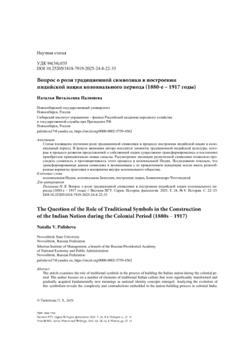 Статья посвящена изучению роли традиционной символики в процессе построения индийской нации в колониальный период. В фокусе внимания автора находятся элементы традиционной индийской культуры, которые в процессе развития представлений о собственной нации существенно трансформировались и постепенно приобретали принципиально новые смыслы. Рассмотрение эволюции религиозной символики позволило проследить сложность и противоречивость этого процесса в колониальной Индии. Исследование показало, что трансформированная данная символика и возникающие с ее привлечением концепции могли иметь разнообразные варианты трактовки и восприятия внутри колониального общества.
