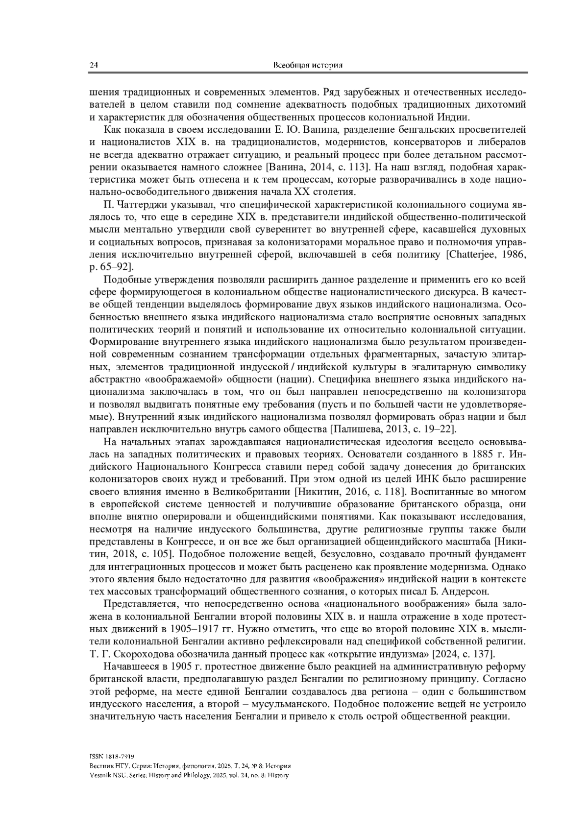 7. Скороходова Т. Г. «Открытие индуизма»: феномен общественной мысли Бенгальского Возрождения // Современные востоковедческие исследование. 2024. Т. 6, № 1. С. 136-154. https://doi.org/10.24412/2686-9675-1-2024-136-154