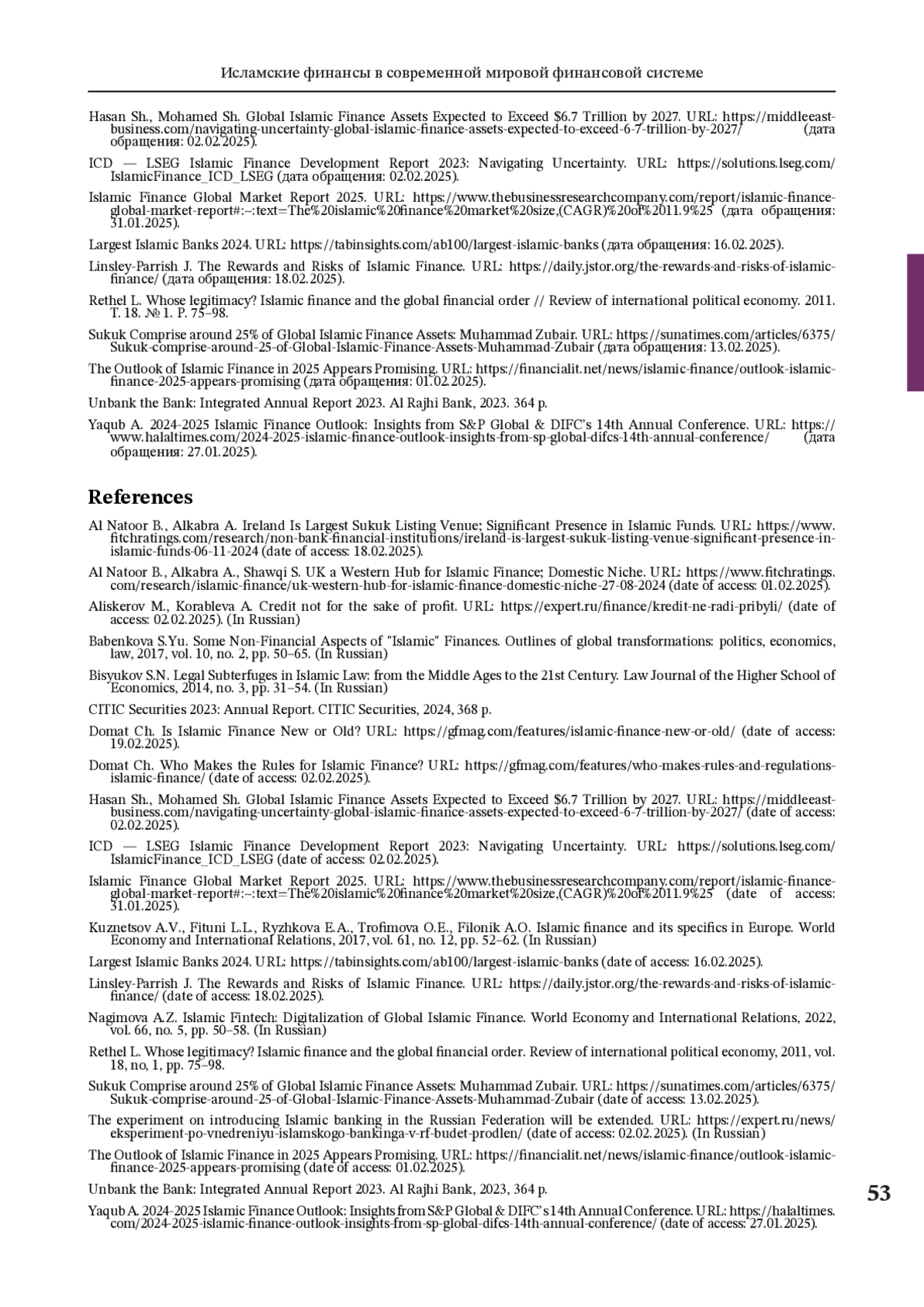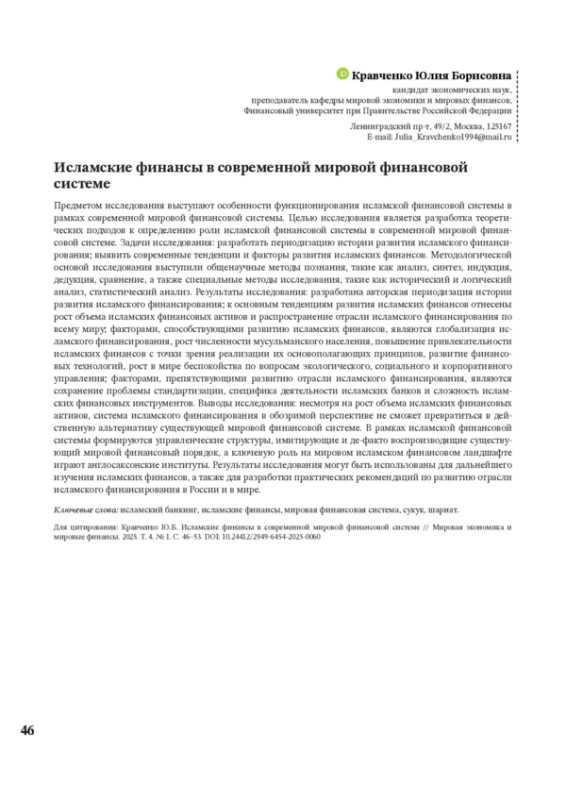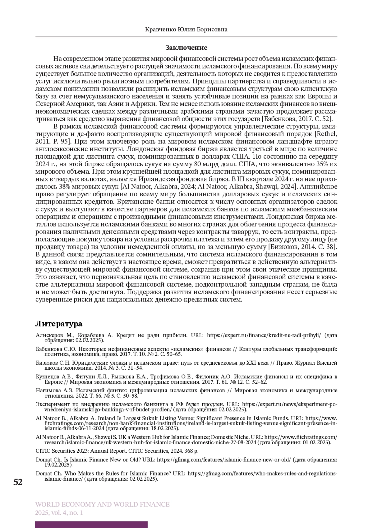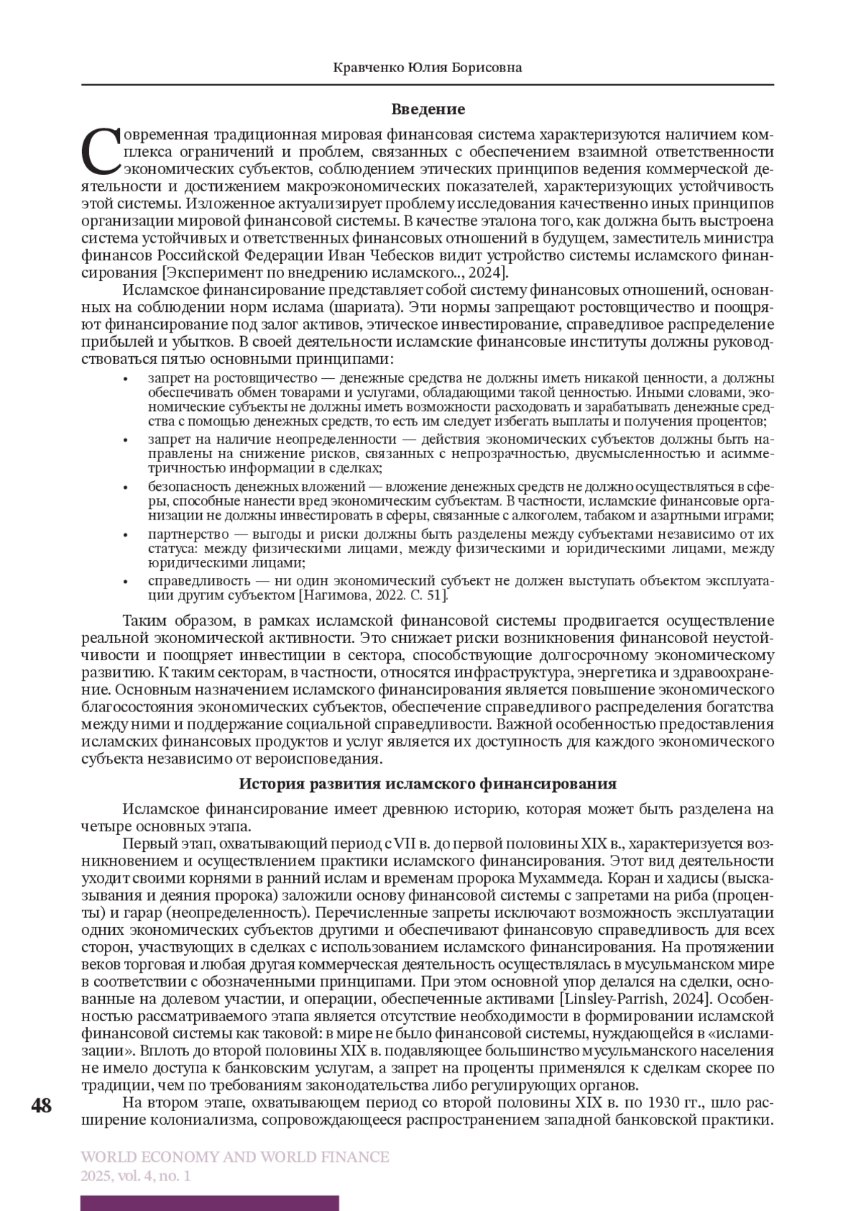 КРАВЧЕНКО Ю. Б. ИСЛАМСКИЕ ФИНАНСЫ В СОВРЕМЕННОЙ МИРОВОЙ ФИНАНСОВОЙ СИСТЕМЕ // МИРОВАЯ ЭКОНОМИКА И МИРОВЫЕ ФИНАНСЫ. 2025. № 1, ТОМ 4