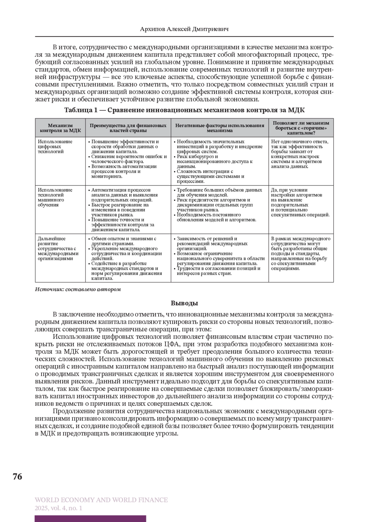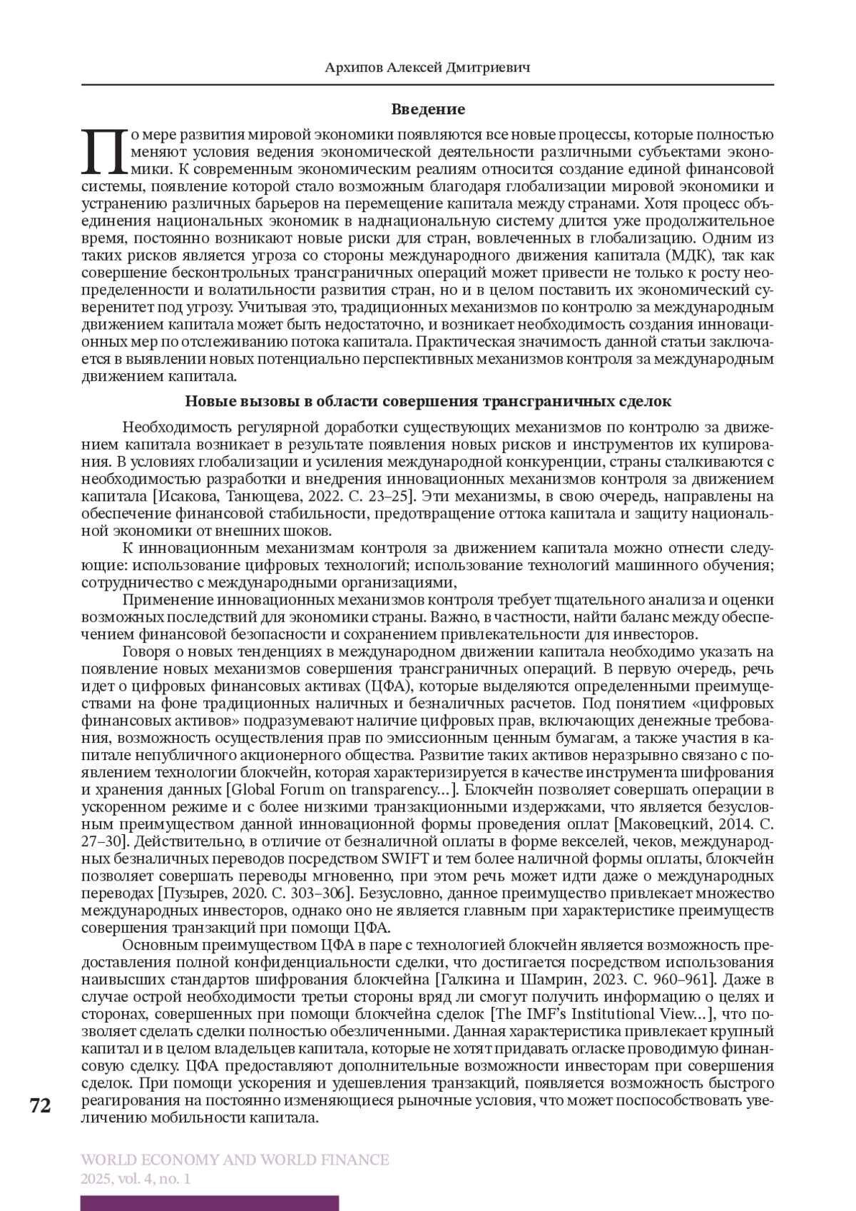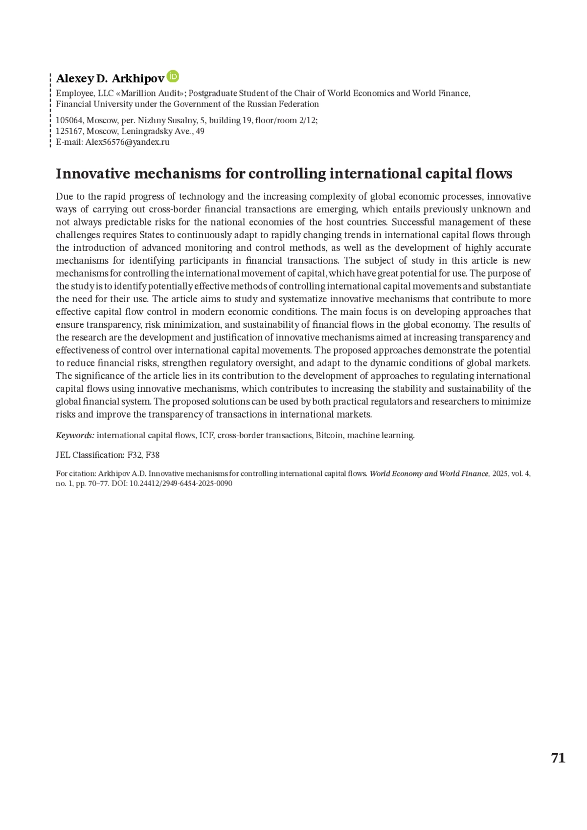 В условиях стремительного прогресса технологий и усложнения глобальных экономических процессов появляются инновационные способы осуществления трансграничных финансовых операций, что влечет за собой порождение ранее неизвестных и не всегда прогнозируемых рисков для национальных экономик принимающих стран. Успешное управление этими вызовами требует от государств непрерывной адаптации к стремительно трансформирующимся тенденциям международного движения капитала посредством внедрения передовых методов мониторинга и контроля, а также разработки высокоточных механизмов идентификации участников финансовых операций. Предметом изучения в данной статье являются новые механизмы контроля за международным движением капитала, имеющие большие перспективы использования. Целью исследования является выявление потенциально эффективных методов контроля за международным движением капитала и обоснование необходимости их использования. Статья ставит своей задачей исследование и систематизацию инновационных механизмов, способствующих более эффективному контролю за движением капитала в современных экономических условиях. Основное внимание уделено разработке подходов, которые обеспечивают прозрачность, минимизацию рисков и устойчивость финансовых потоков в глобальной экономике. Результатами исследования является разработка и обоснование инновационных механизмов, направленных на усиление прозрачности и эффективности контроля за международным движением капитала. Предложенные подходы демонстрируют потенциал для снижения финансовых рисков, усиления регуляторного надзора и адаптации к динамичным условиям глобальных рынков. Значимость статьи заключается в её вкладе в развитие подходов к регулированию международного движения капитала с использованием инновационных механизмов, что способствует повышению стабильности и устойчивости глобальной финансовой системы. Предложенные решения могут быть использованы как практическими регуляторами, так и исследователями для минимизации рисков и улучшения прозрачности транзакций на международных рынках.