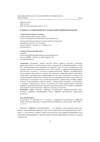 Предметом данной научной работы является феномен гуманизма, прошедший многие стадии развития своего содержания и оборачивающийся в наши дни дегуманизацией при попадании на цифровое поле. В статье утверждается, что текущие процессы дегуманизации могут быть связаны с цифровой трансформацией деятельности человека, в частности профессиональной. Веками складывающиеся виды активной деятельности человека при переходе в цифровой формат утрачивают сущностные характеристики, видоизменяются или вовсе пропадают в процессе их алгоритмизации и роботизации. Истина бытия, открываемая человеку посредством его деятельности, оказывается под угрозой нераскрытия в современных условиях цифровизации. В исследовании ставится вопрос о необходимых установках и требованиях к человеку и прежде всего каждого к самому себе, чтобы возрастающие тенденции цифровой дегуманизации были заменены новой возможностью ступания на цифровое пространство в качестве более гуманного существа, чем прежде.
