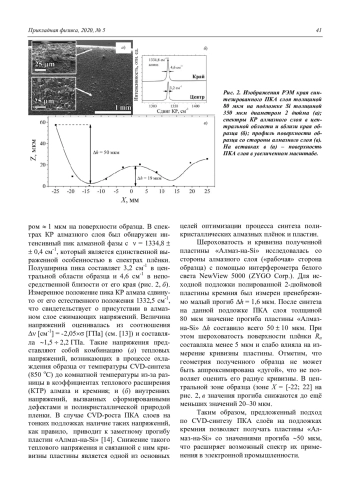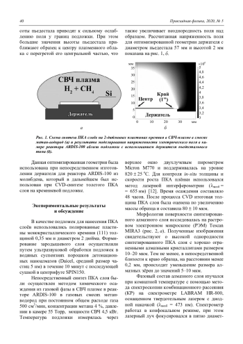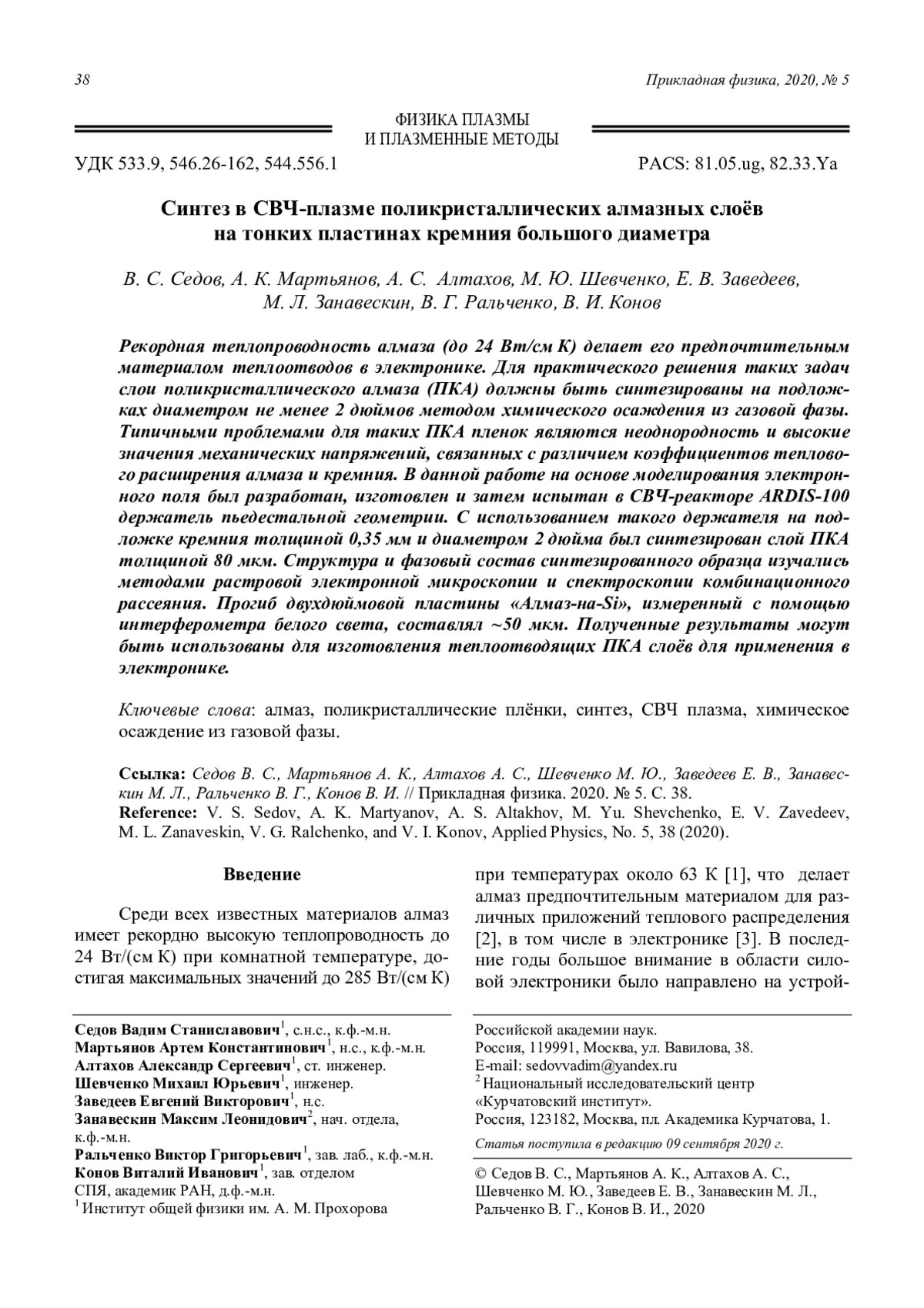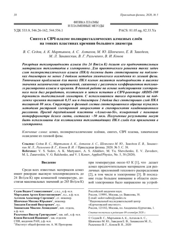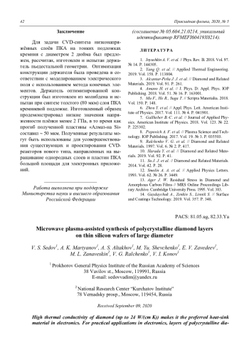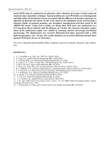 Рекордная теплопроводность алмаза (до 24 Вт/см К) делает его предпочтительным материалом теплоотводов в электронике. Для практического решения таких задач слои поликристаллического алмаза (ПКА) должны быть синтезированы на подложках диаметром не менее 2 дюймов методом химического осаждения из газовой фазы. Типичными проблемами для таких ПКА пленок являются неоднородность и высокие значения механических напряжений, связанных с различием коэффициентов теплового расширения алмаза и кремния. В данной работе на основе моделирования электронного поля был разработан, изготовлен и затем испытан в СВЧ-реакторе ARDIS-100 держатель пьедестальной геометрии. С использованием такого держателя на подложке кремния толщиной 0,35 мм и диаметром 2 дюйма был синтезирован слой ПКА толщиной 80 мкм. Структура и фазовый состав синтезированного образца изучались методами растровой электронной микроскопии и спектроскопии комбинационного рассеяния. Прогиб двухдюймовой пластины «Алмаз-на-Si», измеренный с помощью интерферометра белого света, составлял ~50 мкм. Полученные результаты могут быть использованы для изготовления теплоотводящих ПКА слоёв для применения в электронике.