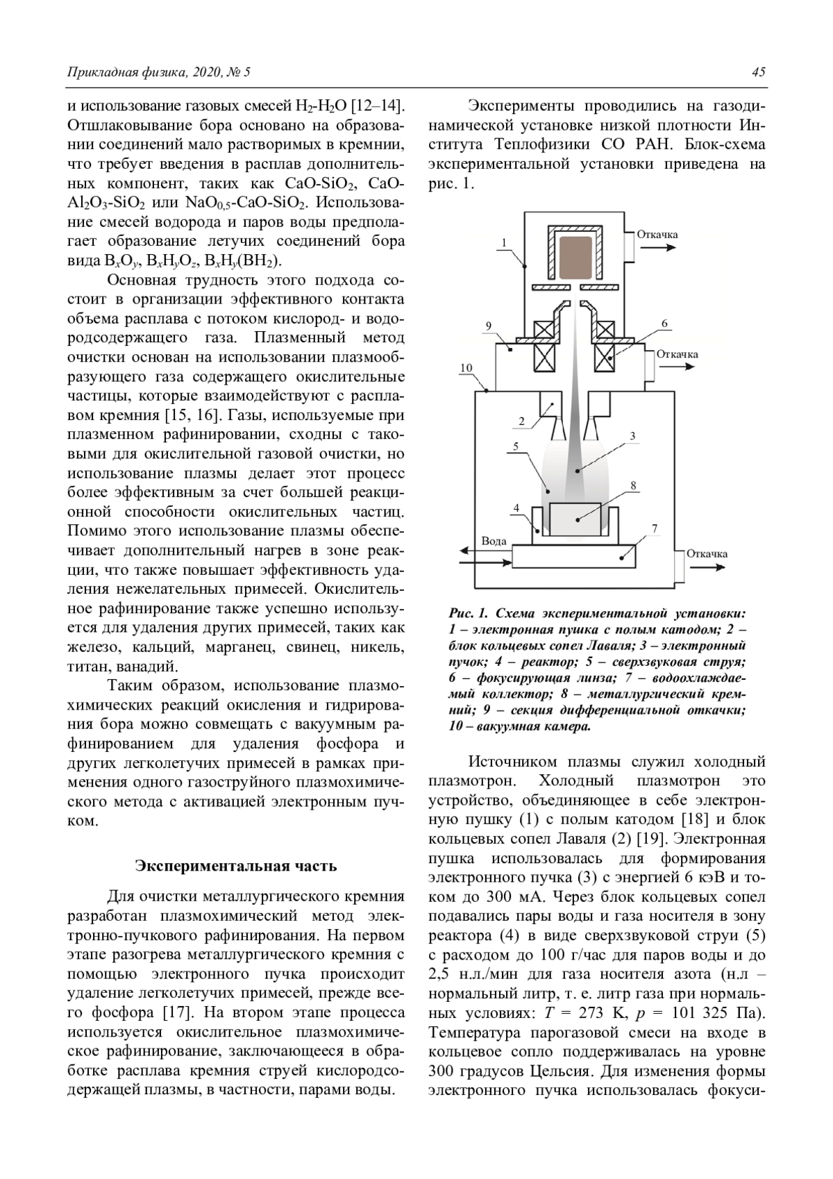 Разработано устройство для рафинирования металлургического кремния в плазме электронного пучка в сверхзвуковом потоке газа. Представлено описание и демонстрация возможностей электронно-пучкового метода и плазмы на его основе для удаления примесей из металлургического кремния в условиях форвакуумного диапазона давлений. На лабораторном оборудовании получены образцы кремния в варианте окислительного рафинирования с использованием паров воды.
