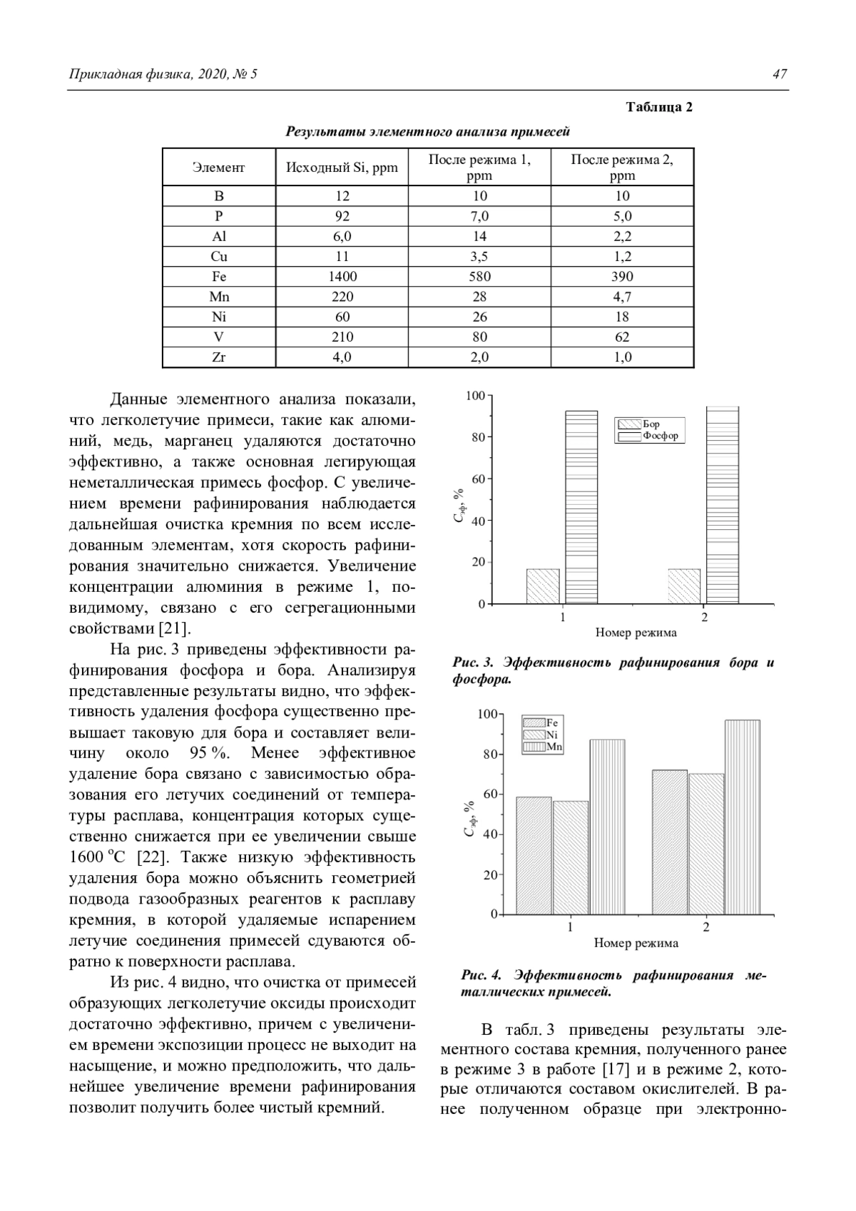 Для увеличения эффективности рафинирования бора необходимо контролировать температуру расплава и изменить геометрию подачи газообразных реагентов с целью удаления испаренных примесей из области обработки электронным пучком. Для выбора оптимального режима образования его легколетучих соединений в зависимости от параметров процесса в дальнейшем планируется использование масс-спектрометрических измерений.