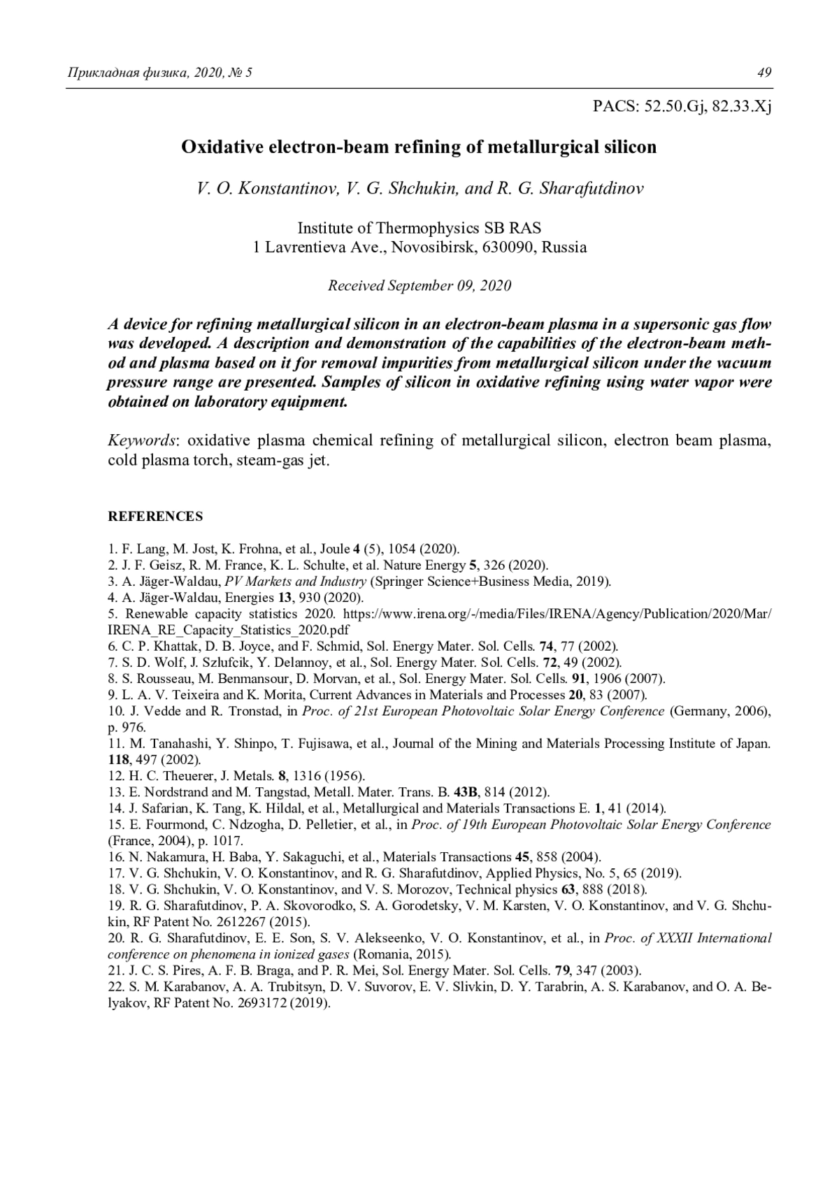 Константинов В. О., Щукин В. Г., Шарафутдинов Р. Г. Окислительное электронно-пучковое рафинирование металлургического кремния 44