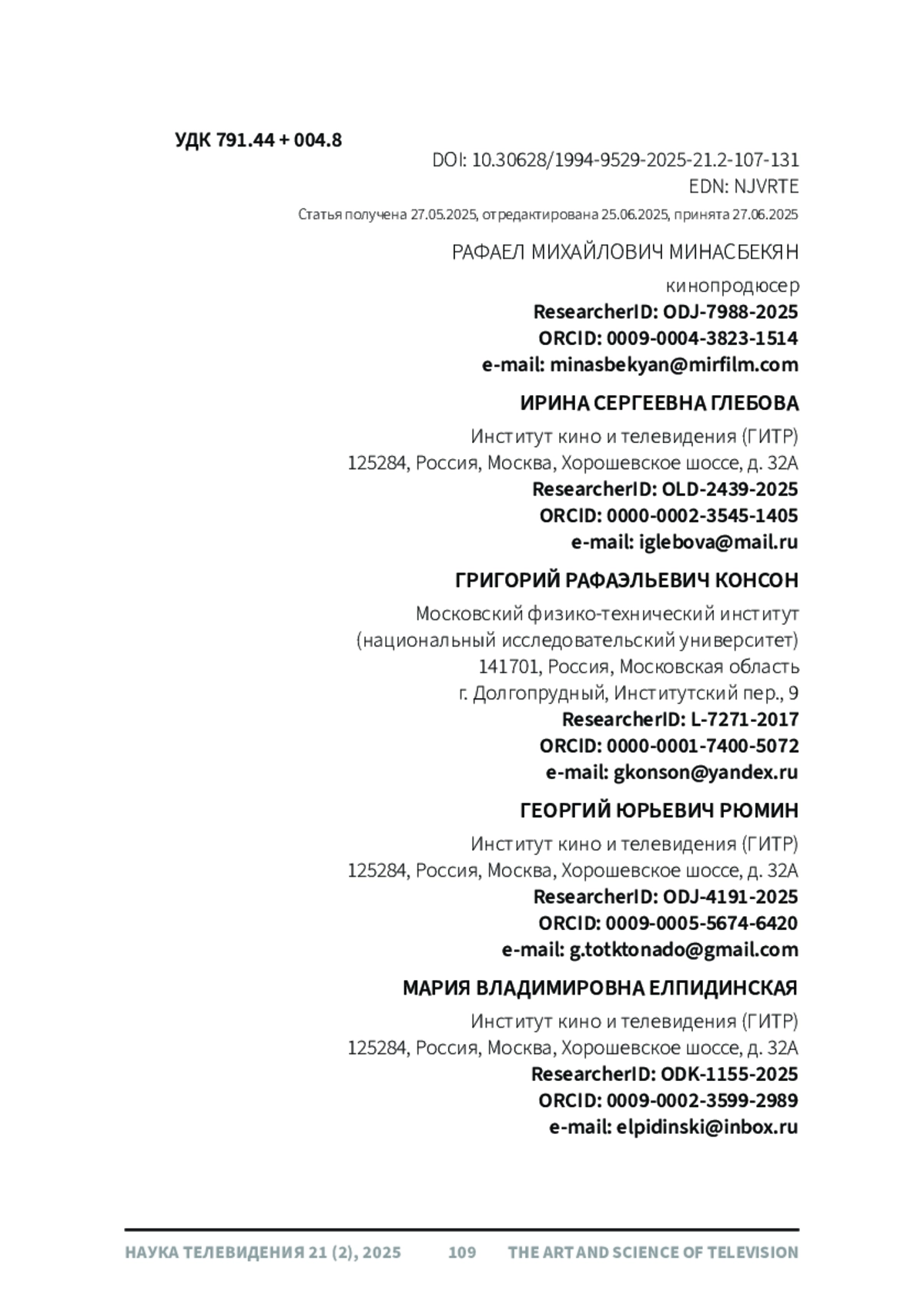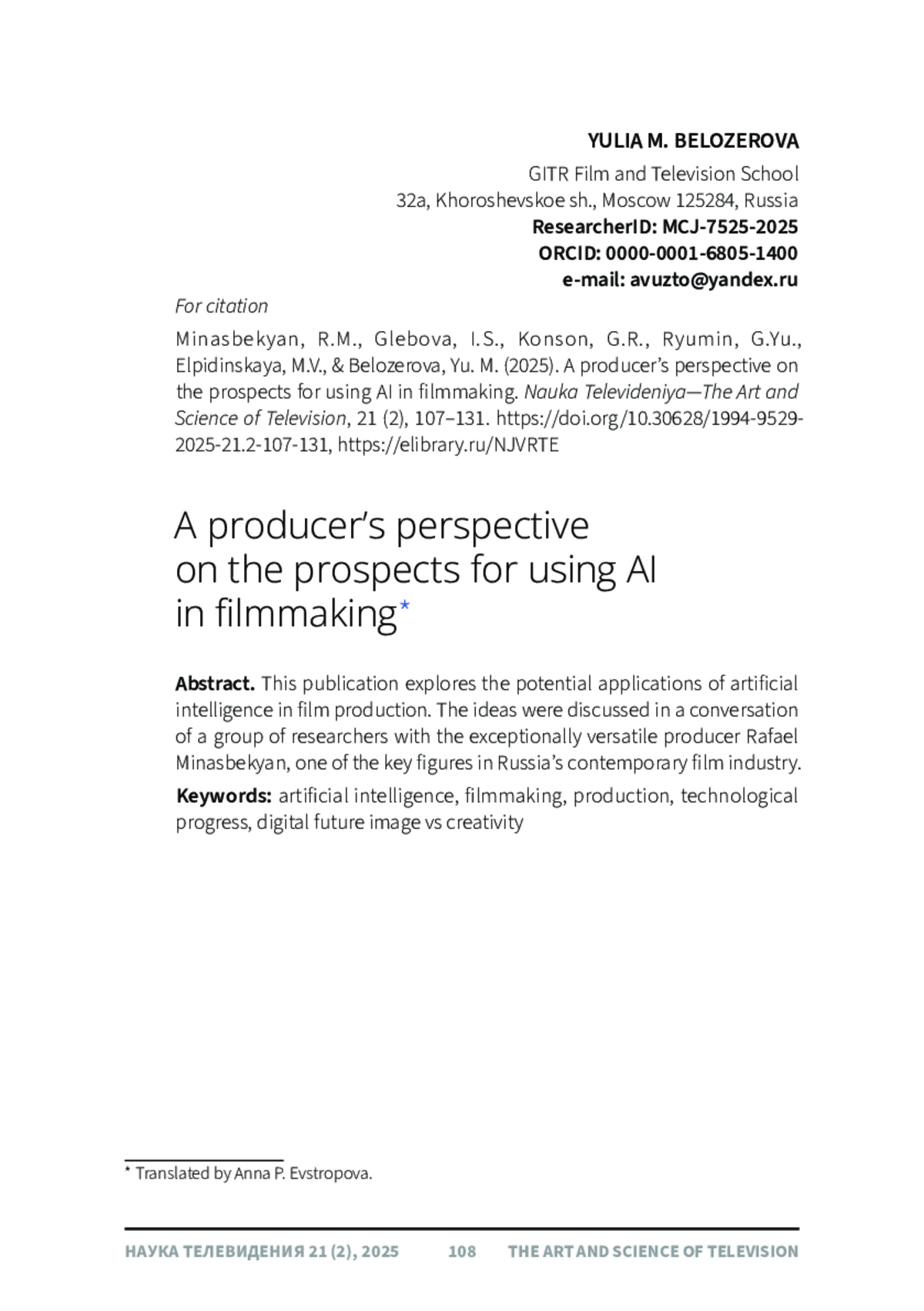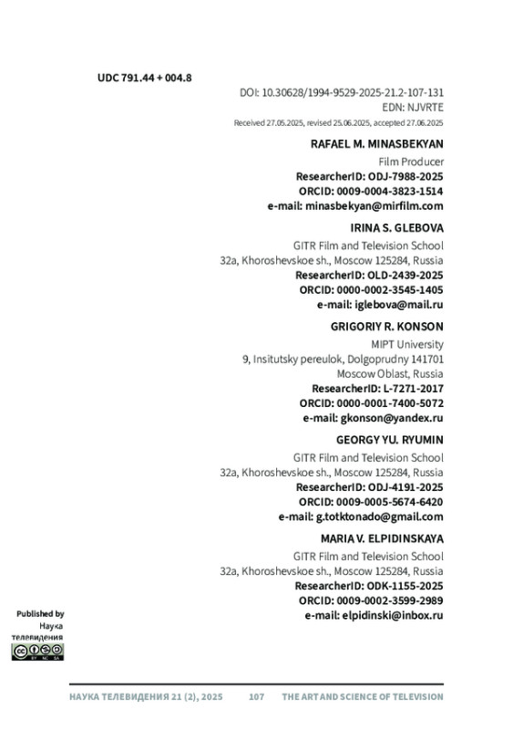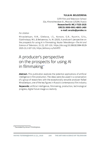 МИНАСБЕКЯН Р. М., ГЛЕБОВА И. С., КОНСОН Г. Ю., РЮМИН Г. Ю., ЕЛПИДИНСКАЯ М. В., БЕЛОЗЕРОВА Ю. М. ПРОДЮСЕРСКИЙ ВЗГЛЯД НА ПЕРСПЕКТИВЫ ИСПОЛЬЗОВАНИЯ ИСКУССТВЕННОГО ИНТЕЛЛЕКТА В КИНОПРОИЗВОДСТВЕ // НАУКА ТЕЛЕВИДЕНИЯ. 2025. 21 (2)