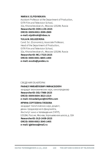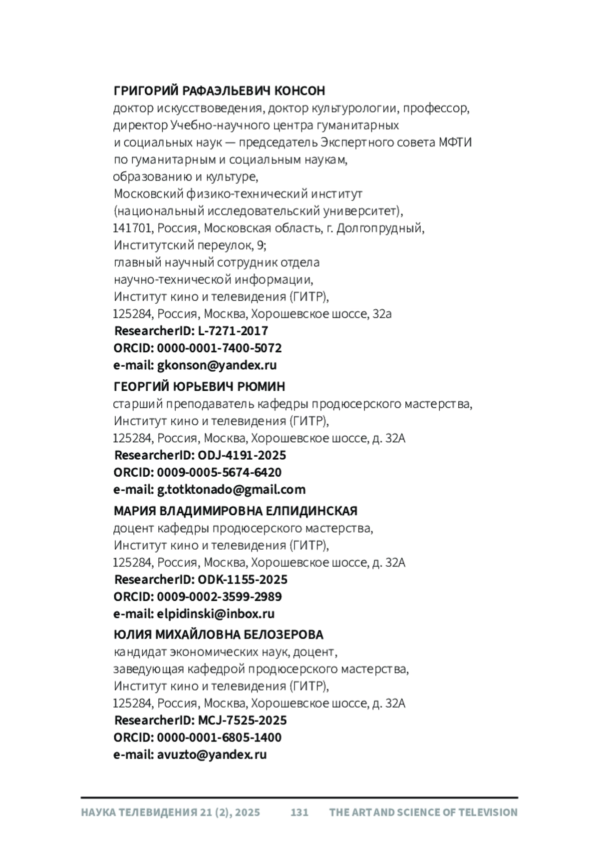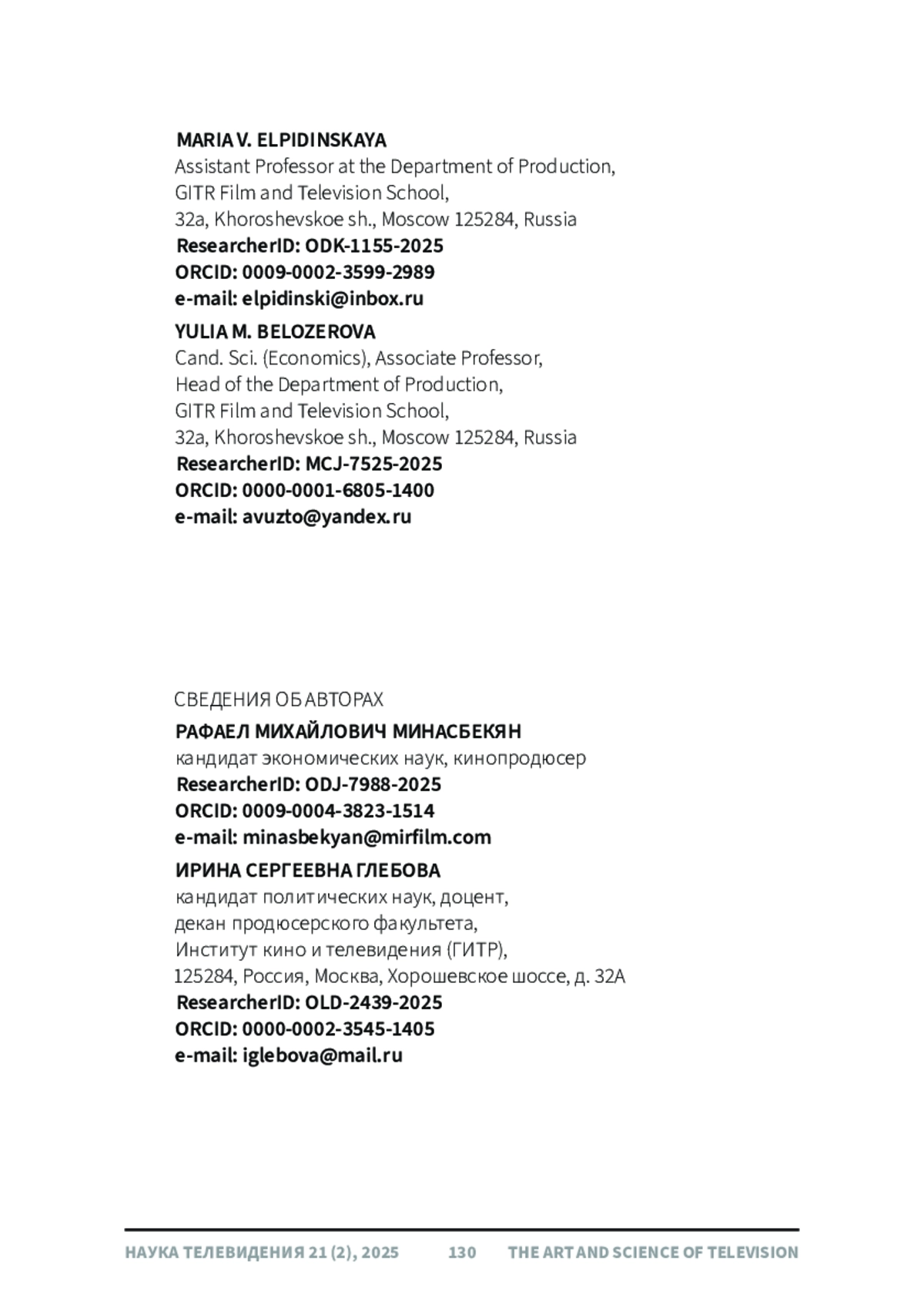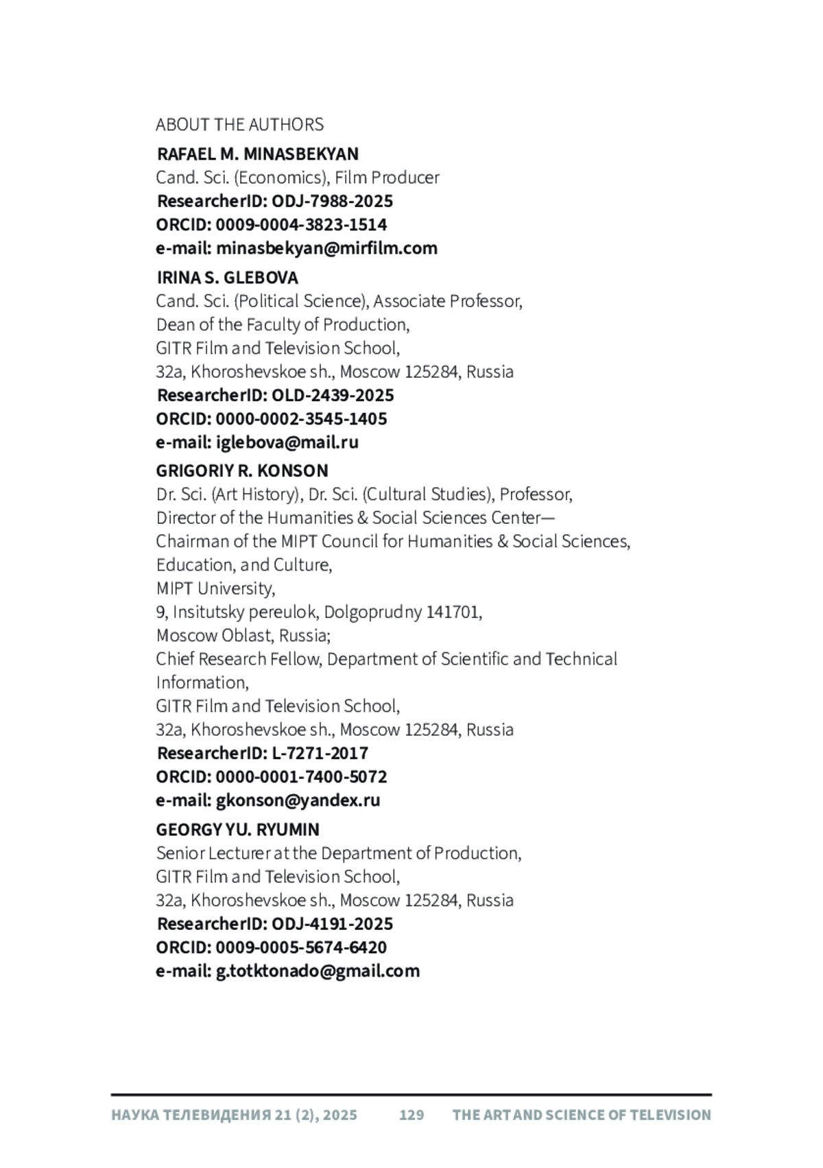 МИНАСБЕКЯН Р. М., ГЛЕБОВА И. С., КОНСОН Г. Ю., РЮМИН Г. Ю., ЕЛПИДИНСКАЯ М. В., БЕЛОЗЕРОВА Ю. М. ПРОДЮСЕРСКИЙ ВЗГЛЯД НА ПЕРСПЕКТИВЫ ИСПОЛЬЗОВАНИЯ ИСКУССТВЕННОГО ИНТЕЛЛЕКТА В КИНОПРОИЗВОДСТВЕ // НАУКА ТЕЛЕВИДЕНИЯ. 2025. 21 (2)