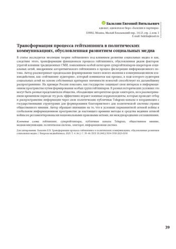 В статье исследуется эволюция теории гейткипинга под влиянием развития социальных медиа и как, следствие этого, трансформация функционала процесса гейткипинга, обусловленная рядом факторов: утратой влияния традиционных СМИ, появлением особой категории супергейткиперов-операторов социальных сетей, внедрением алгоритмического гейткипинга в процесс фильтрации информационного потока. Автор рассматривает предпосылки формирования такого нового явления в коммуникационном взаимодействии, как «гейткипинг аудитории», который понимается как процесс, в ходе которого аудитория социальных сетей на основе собственных критериев значимости новостей способствует их дальнейшему распространению. На примере России показано, как государство защищает свои интересы в информационном пространстве путем формирования особых групп гейткиперов. В разных исторических условиях это могут быть разные представители общества, обладающие авторитетом среди электората, но в рассматриваемом временном периоде эту роль эффективно играют военные корреспонденты, которые проводят отбор и распространение информации через свои политические публичные Telegram-каналы в координации с государственными структурами для формирования благоприятного для политической системы страны общественного мнения. Автор обращает внимание на то, что в условиях перманентной сетевой войны в глобальном информационном пространстве до настоящего времени методы и средства ведения сетевой войны не регламентированы ни национальными правовыми актами, ни международными соглашениями.