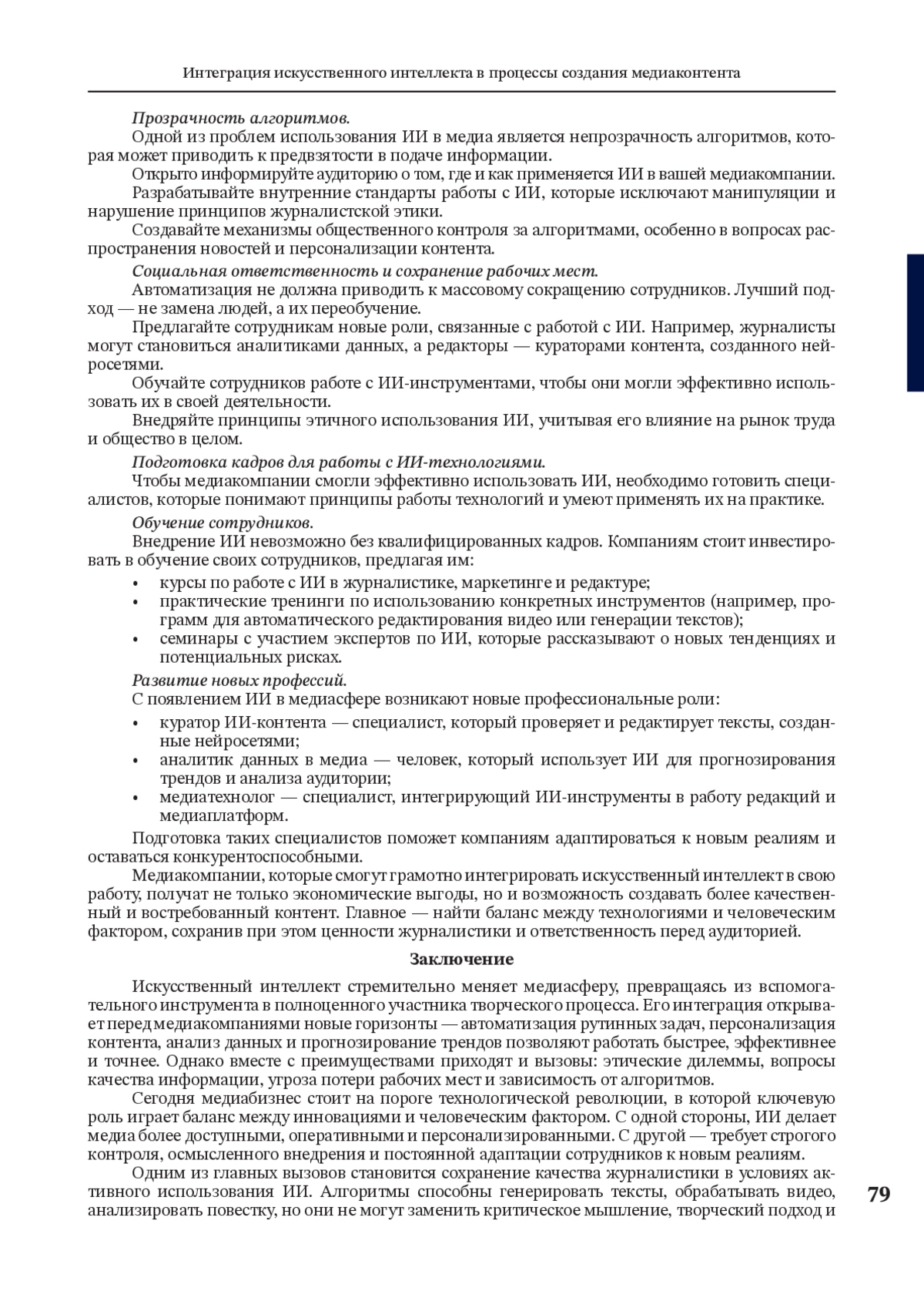 2. Дроздов Д.Н. Генерируемый искусственным интеллектом контент как составная часть контент-стратегии современных медиа // Журнал Белорусского государственного университета. Журналистика. 2024. № 2. С. 25-30.