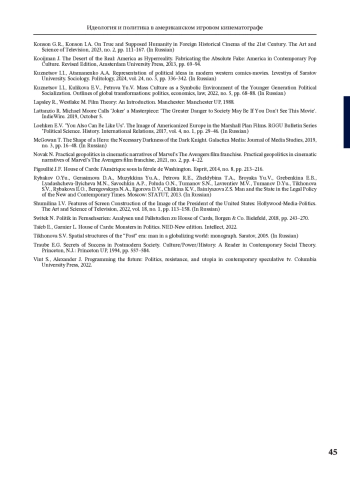 23. Novak N. Practical geopolitics in cinematic narratives of Marvel’s The Avengers film franchise // Practical geopolitics in cinematic narratives of Marvel’s The Avengers film franchise. 2021. № 2. P. 4-22.
