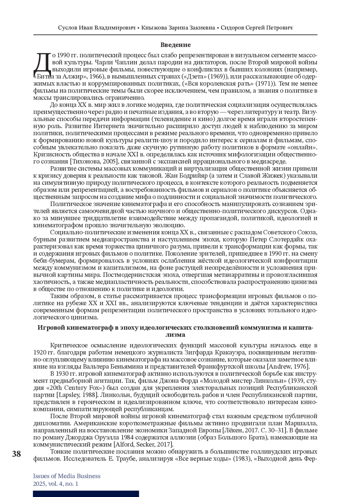 4. Белов С.И. Манипулятивный потенциал массовой культуры как инструмента политического воздействия // Вестник Российского университета дружбы народов. Серия: Политология. 2024. № 2. С. 254-262.