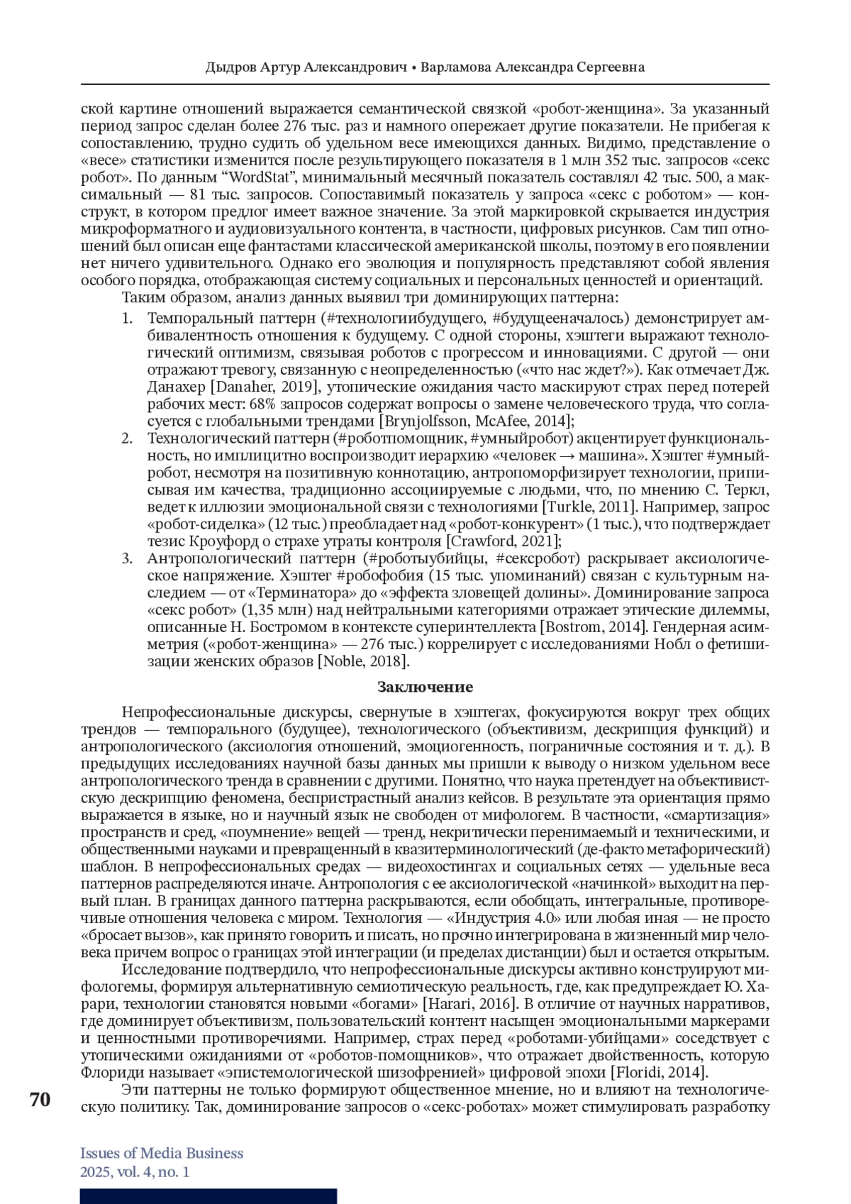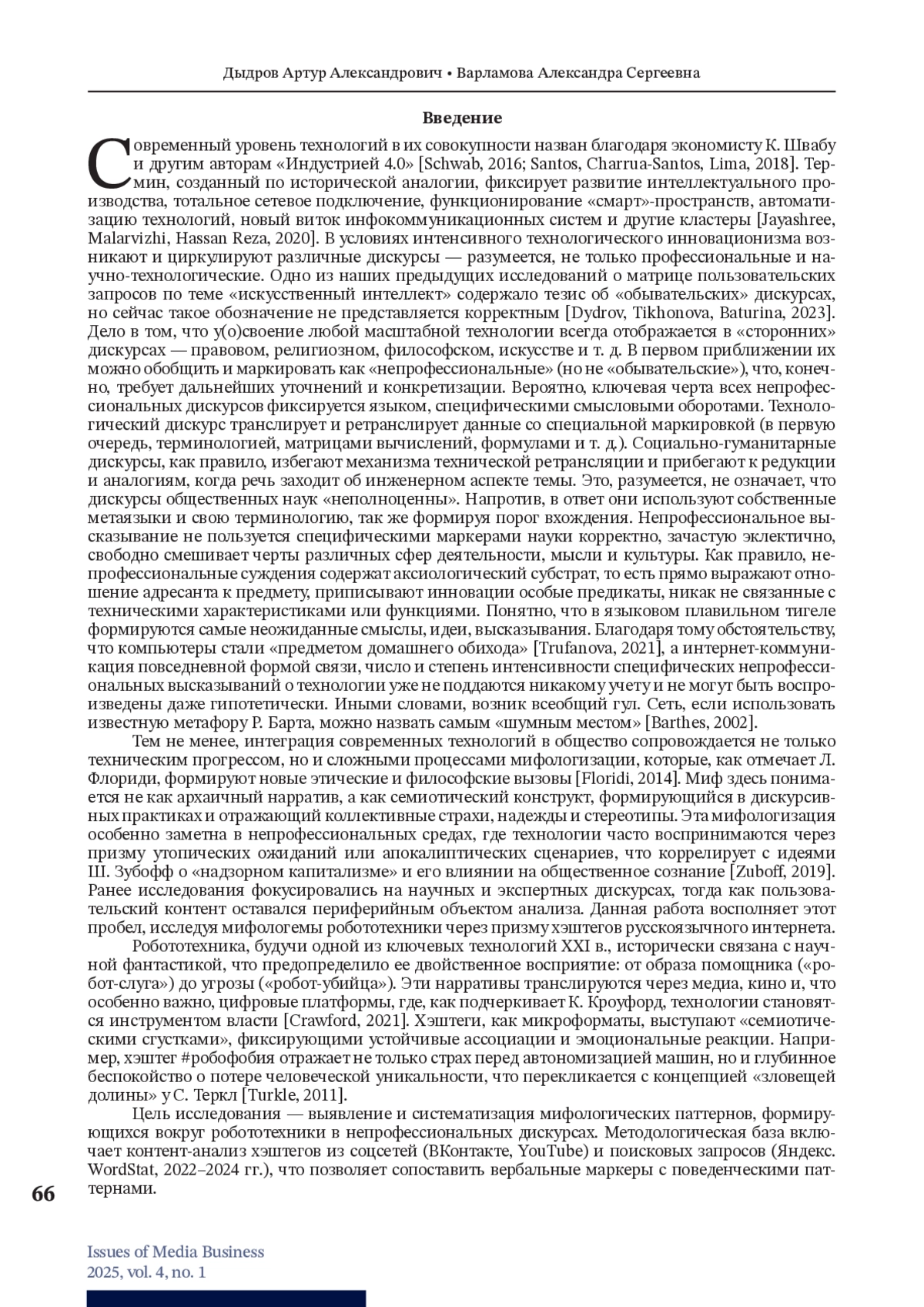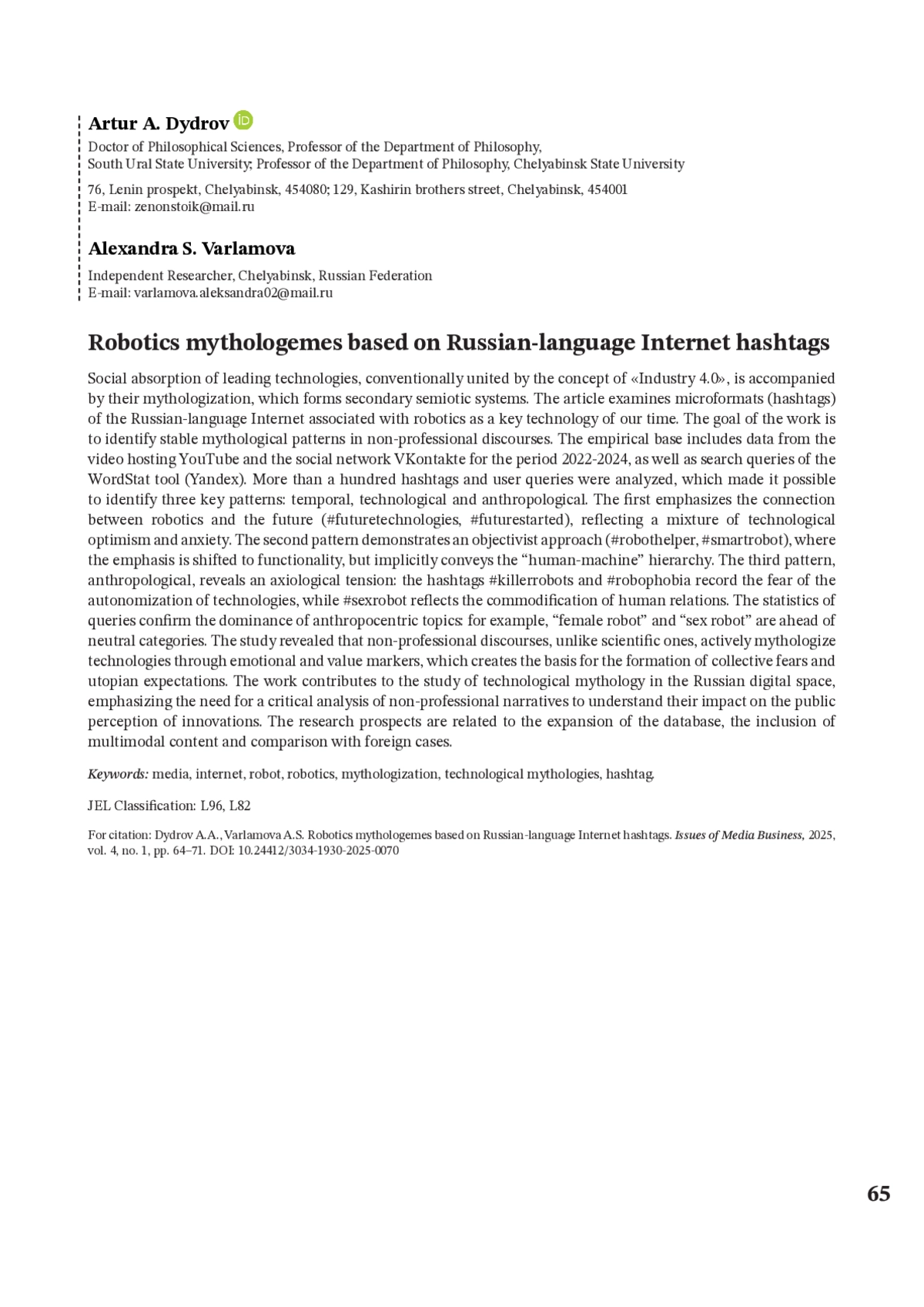 Социальная абсорбция ведущих технологий, условно объединенных концептом «Индустрия 4.0», сопровождается их мифологизацией, формирующей вторичные семиотические системы. В статье исследуются микроформаты (хэштеги) русскоязычного интернета, связанные с робототехникой как ключевой технологией современности. Цель работы — выявление устойчивых мифологических паттернов в непрофессиональных дискурсах. Эмпирическая база включает данные видеохостинга YouTube и социальной сети ВКонтакте за период 2022–2024 гг., а также поисковые запросы инструмента “WordStat” (Яндекс). Проанализировано более сотни хэштегов и пользовательских запросов, что позволило выделить три ключевых паттерна: темпоральный, технологический и антропологический. Первый акцентирует связь робототехники с будущим ( #технологиибудущего, будущееначалось), отражая смесь технологического оптимизма и тревоги. Второй паттерн демонстрирует объективистский подход ( #роботпомощник, умныйробот), где акцент смещен на функциональность, однако имплицитно транслирует иерархию «человек — машина». Третий паттерн, антропологический, раскрывает аксиологическое напряжение: хэштеги роботыубийцы и робофобия фиксируют страх перед автономизацией технологий, тогда как сексробот отражает коммодификацию человеческих отношений. Статистика запросов подтверждает доминирование антропоцентричных тем: например, «робот-женщина» и «секс-робот» опережают нейтральные категории. Исследование выявило, что непрофессиональные дискурсы, в отличие от научных, активно мифологизируют технологии через эмоциональные и ценностные маркеры, что создает почву для формирования коллективных страхов и утопических ожиданий. Работа вносит вклад в изучение технологической мифологии в российском цифровом пространстве, подчеркивая необходимость критического анализа непрофессиональных нарративов для понимания их влияния на общественное восприятие инноваций. Перспективы исследования связаны с расширением базы данных, включением мультимодального контента и сравнением с зарубежными кейсами.