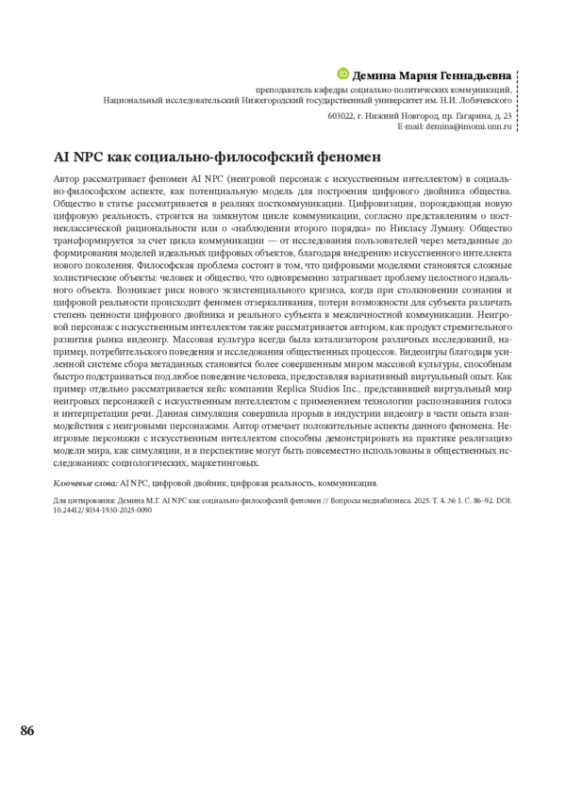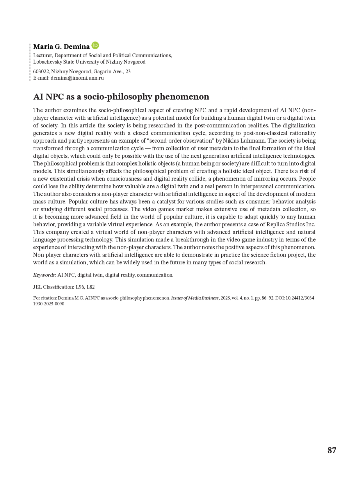Автор рассматривает феномен AI NPC (неигровой персонаж с искусственным интеллектом) в социально-философском аспекте, как потенциальную модель для построения цифрового двойника общества. Общество в статье рассматривается в реалиях посткоммуникации. Цифровизация, порождающая новую цифровую реальность, строится на замкнутом цикле коммуникации, согласно представлениям о постнеклассической рациональности или о «наблюдении второго порядка» по Никласу Луману. Общество трансформируется за счет цикла коммуникации — от исследования пользователей через метаданные до формирования моделей идеальных цифровых объектов, благодаря внедрению искусственного интеллекта нового поколения. Философская проблема состоит в том, что цифровыми моделями становятся сложные холистические объекты: человек и общество, что одновременно затрагивает проблему целостного идеального объекта. Возникает риск нового экзистенциального кризиса, когда при столкновении сознания и цифровой реальности происходит феномен отзеркаливания, потери возможности для субъекта различать степень ценности цифрового двойника и реального субъекта в межличностной коммуникации. Неигровой персонаж с искусственным интеллектом также рассматривается автором, как продукт стремительного развития рынка видеоигр. Массовая культура всегда была катализатором различных исследований, например, потребительского поведения и исследования общественных процессов. Видеоигры благодаря усиленной системе сбора метаданных становятся более совершенным миром массовой культуры, способным быстро подстраиваться под любое поведение человека, предоставляя вариативный виртуальный опыт. Как пример отдельно рассматривается кейс компании Replica Studios Inc., представившей виртуальный мир неигровых персонажей с искусственным интеллектом с применением технологии распознавания голоса и интерпретации речи. Данная симуляция совершила прорыв в индустрии видеоигр в части опыта взаимодействия с неигровыми персонажами. Автор отмечает положительные аспекты данного феномена. Неигровые персонажи с искусственным интеллектом способны демонстрировать на практике реализацию модели мира, как симуляции, и в перспективе могут быть повсеместно использованы в общественных исследованиях: социологических, маркетинговых.