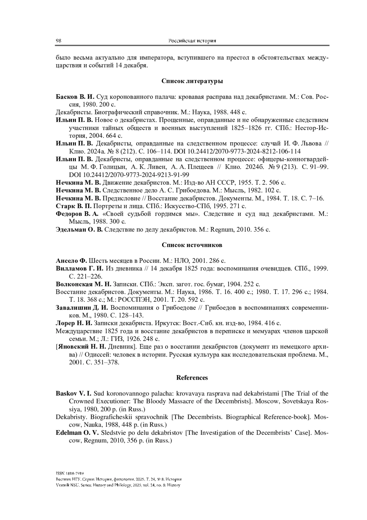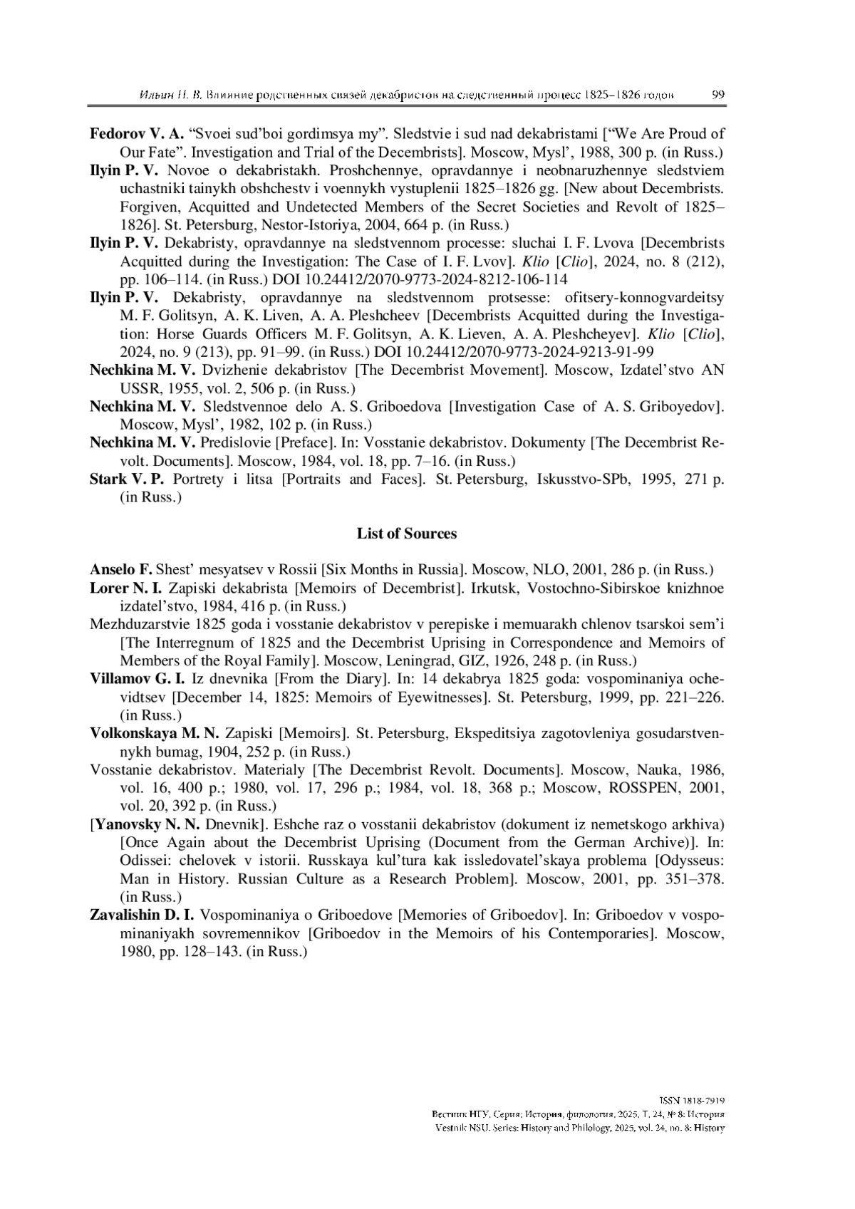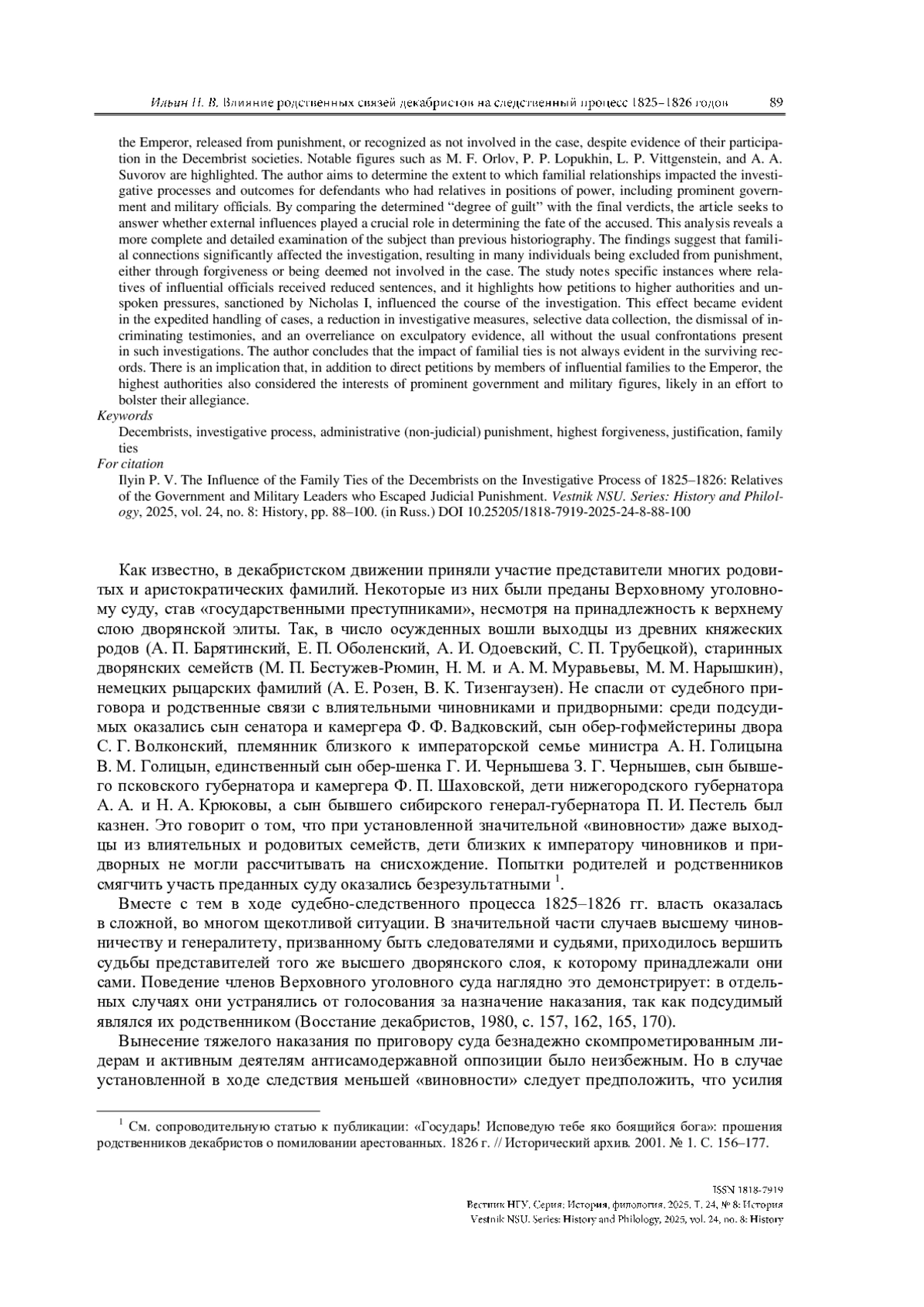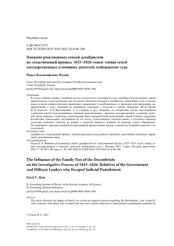 ИЛЬИН П. В. ВЛИЯНИЕ РОДСТВЕННЫХ СВЯЗЕЙ ДЕКАБРИСТОВ НА СЛЕДСТВЕННЫЙ ПРОЦЕСС 1825–1826 ГОДОВ: ЧЛЕНЫ СЕМЕЙ ГОСУДАРСТВЕННЫХ И ВОЕННЫХ ДЕЯТЕЛЕЙ, ИЗБЕЖАВШИЕ СУДА // ВЕСТНИК НГУ. СЕРИЯ: ИСТОРИЯ, ФИЛОЛОГИЯ. 2025. ТОМ 24, № 8